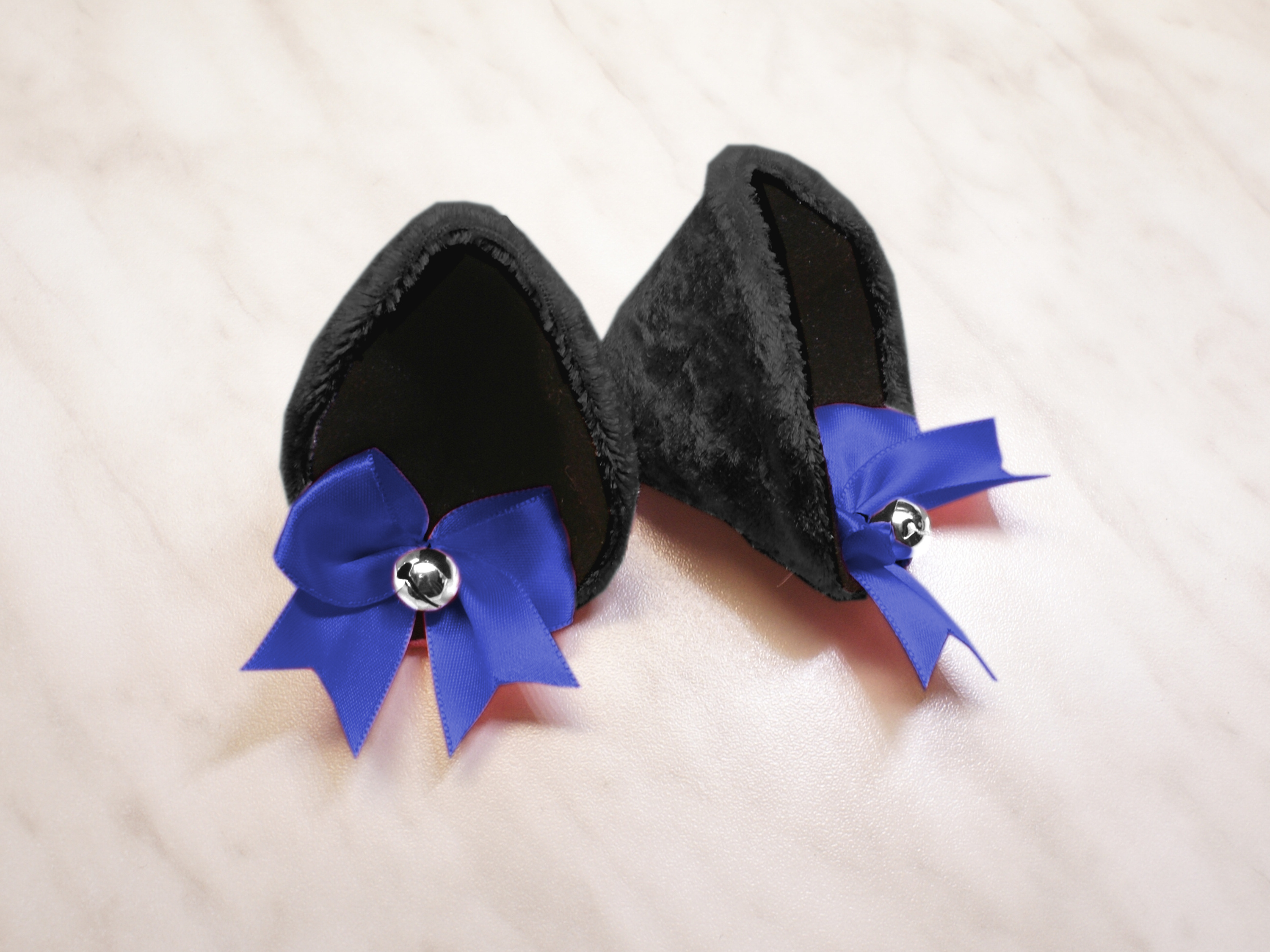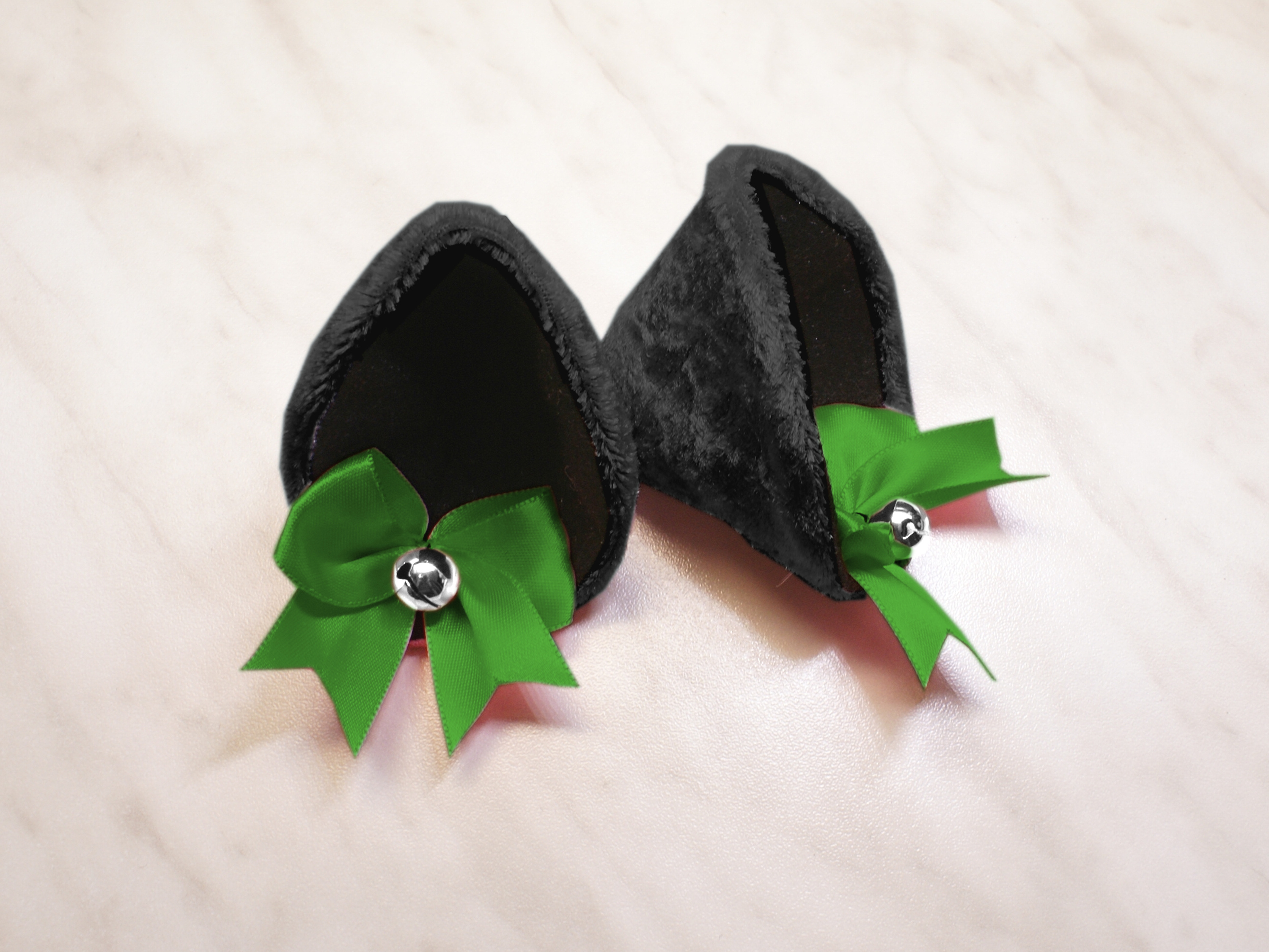 The ears are made of faux fur. Satin ribbons, as ornaments. A bell is attached to the ribbon. A metal clip for attaching the ears is attached to the underside of the ears. Added metal headband so that the ears can be attached to the headband. So you have more options for wearing ears. You can wear them in several ways.