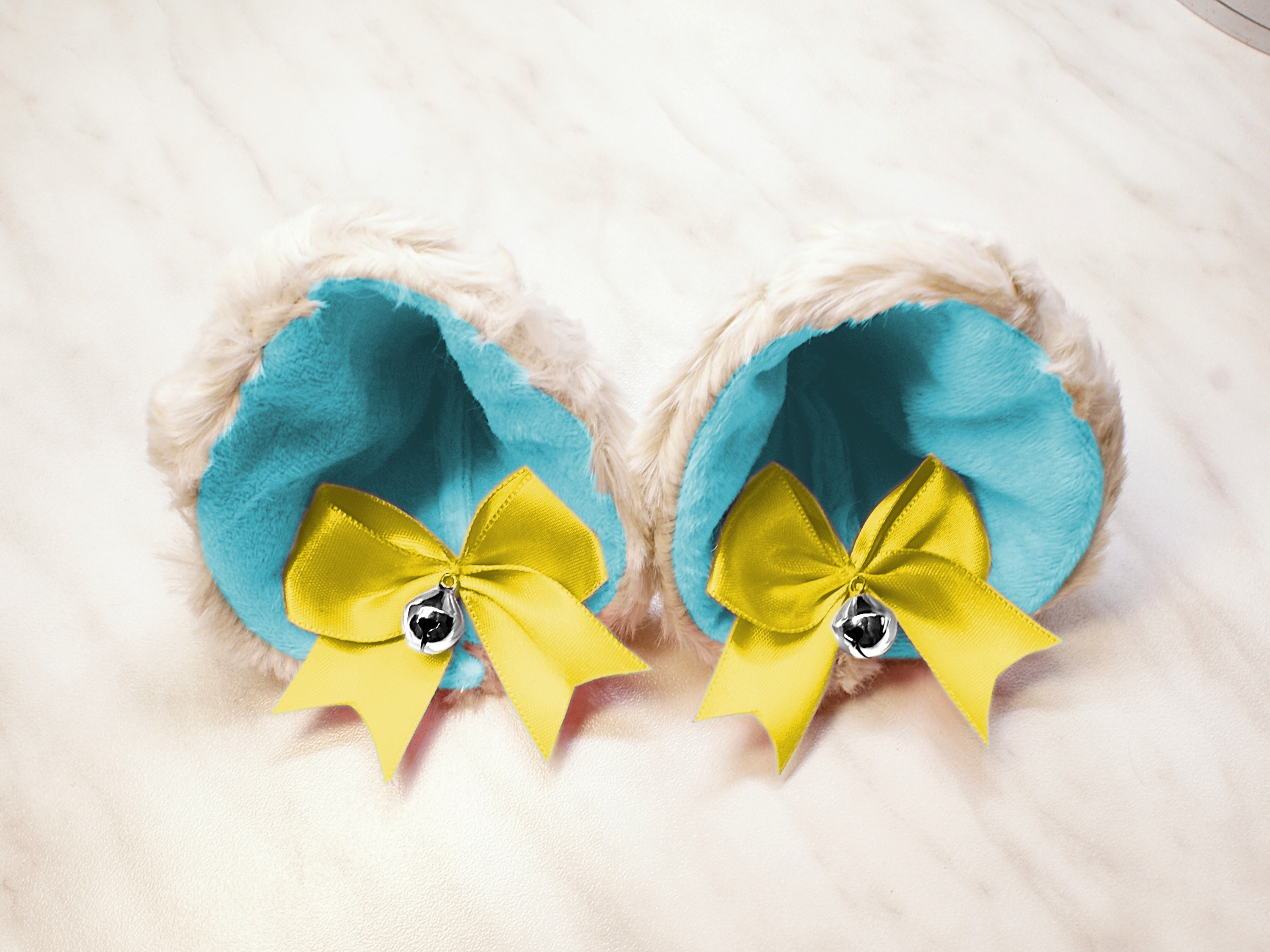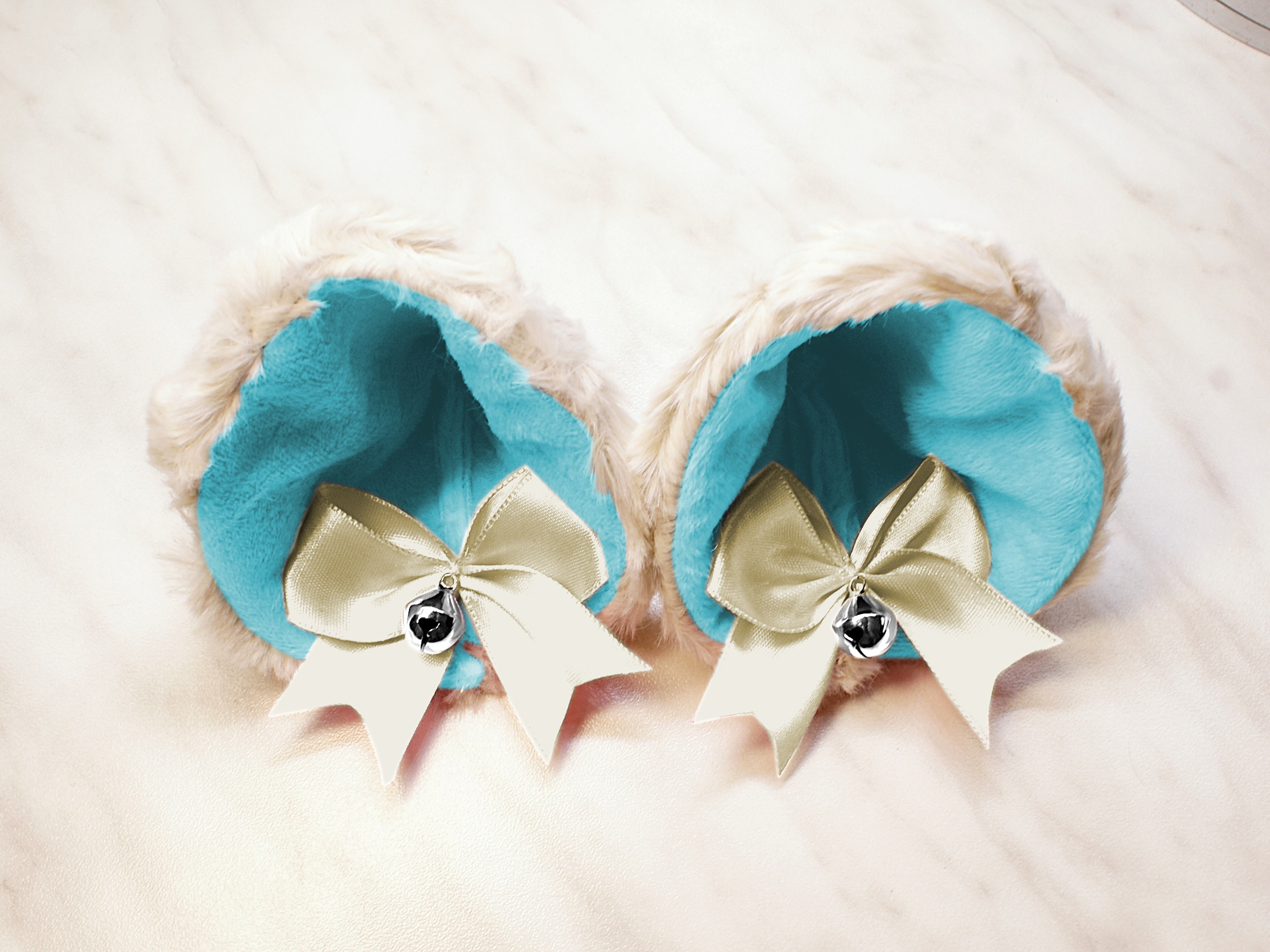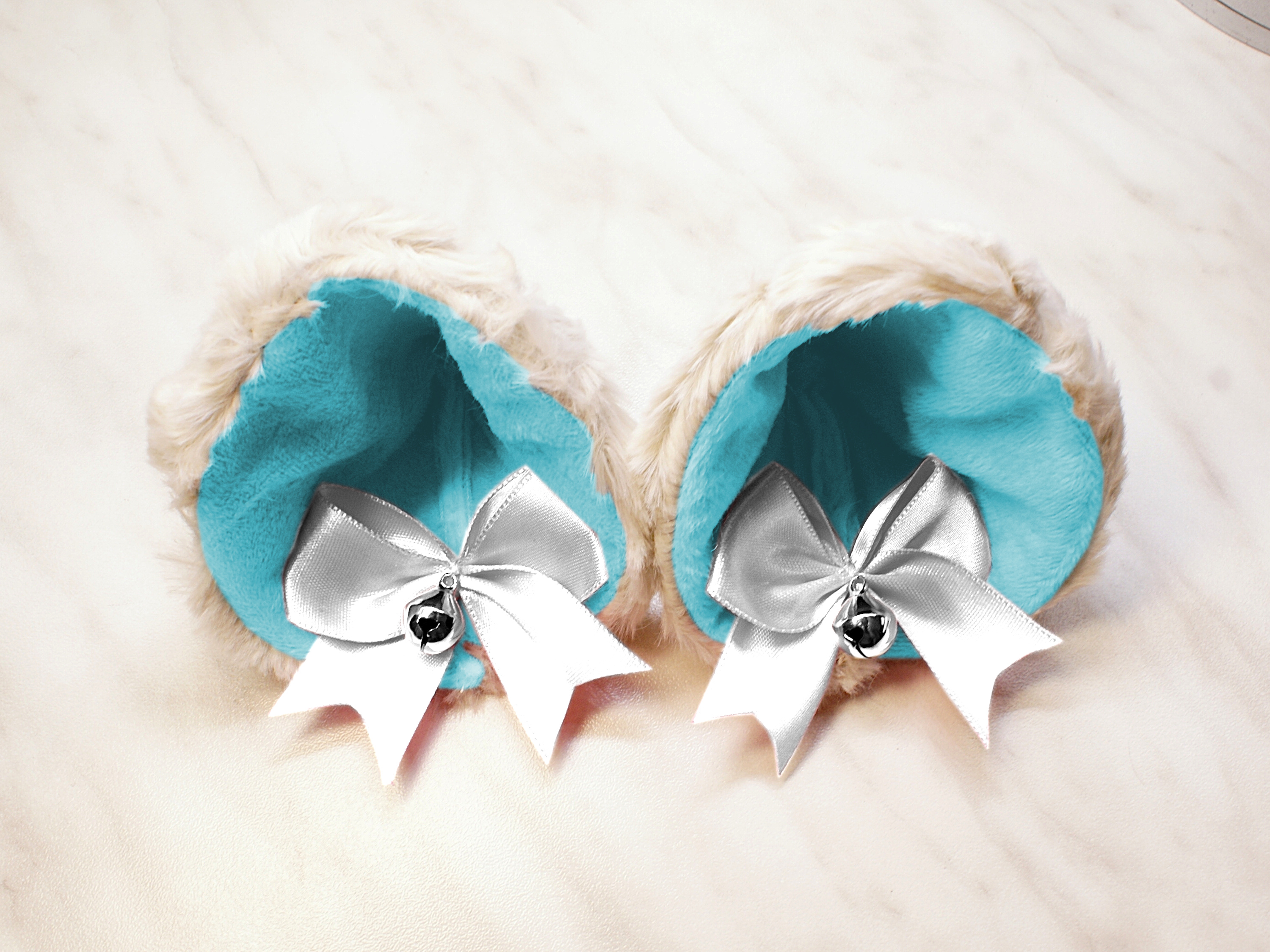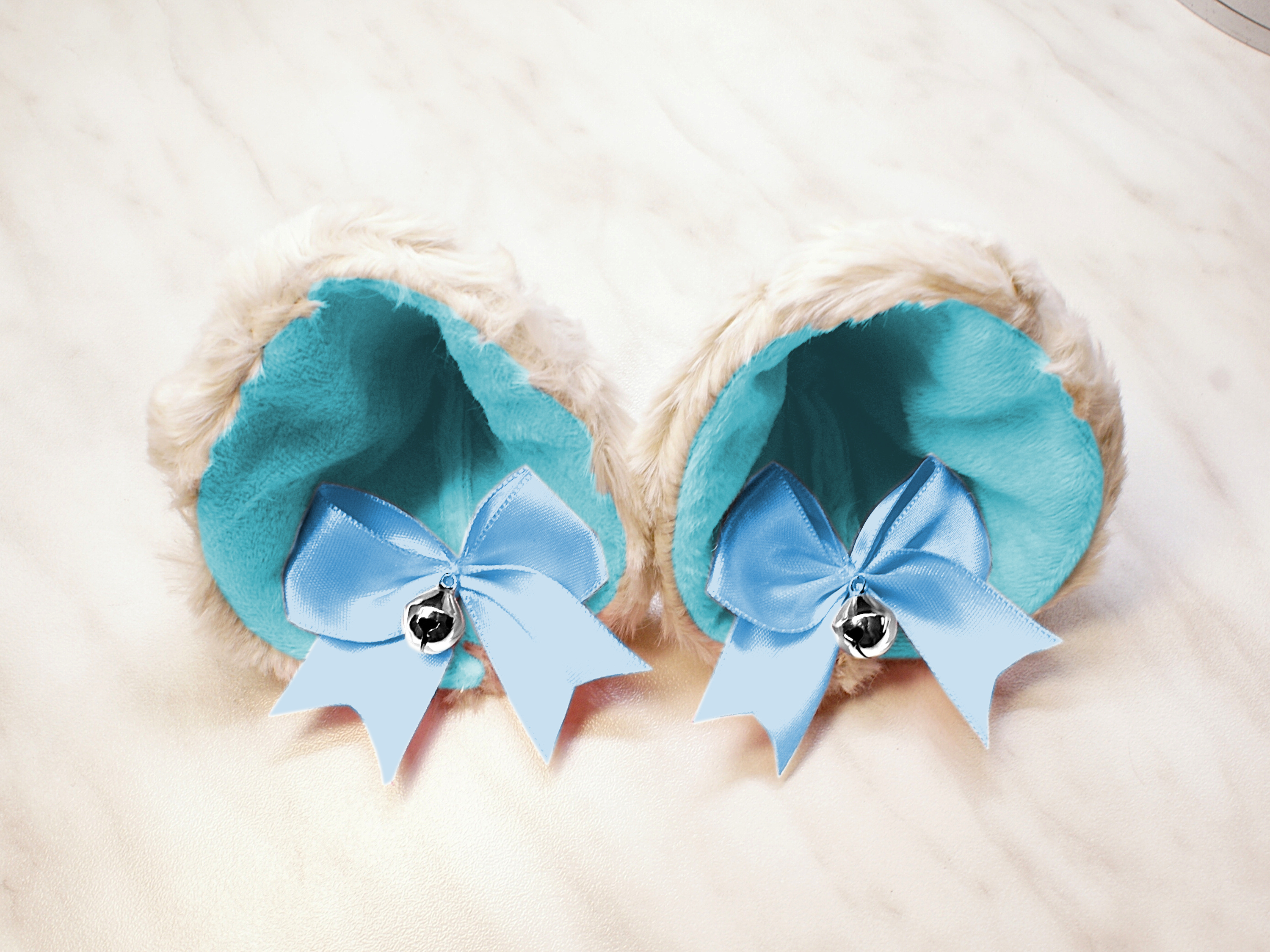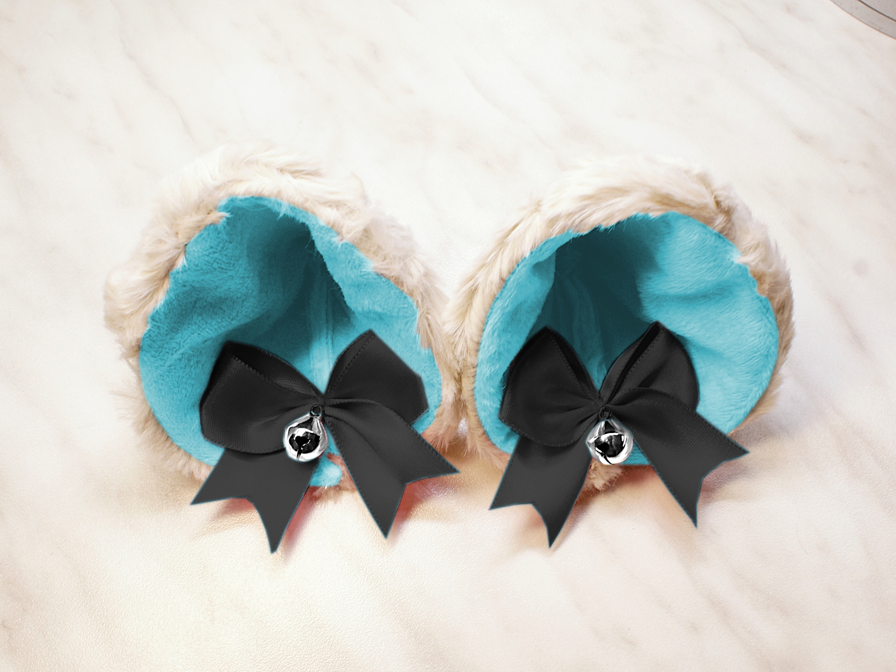 The ears are made of faux fur. Satin ribbons, as ornaments. A bell is attached to the ribbon. A metal clip for attaching the ears is attached to the underside of the ears. Added metal headband so that the ears can be attached to the headband. So you have more options for wearing ears. You can wear them in several ways.