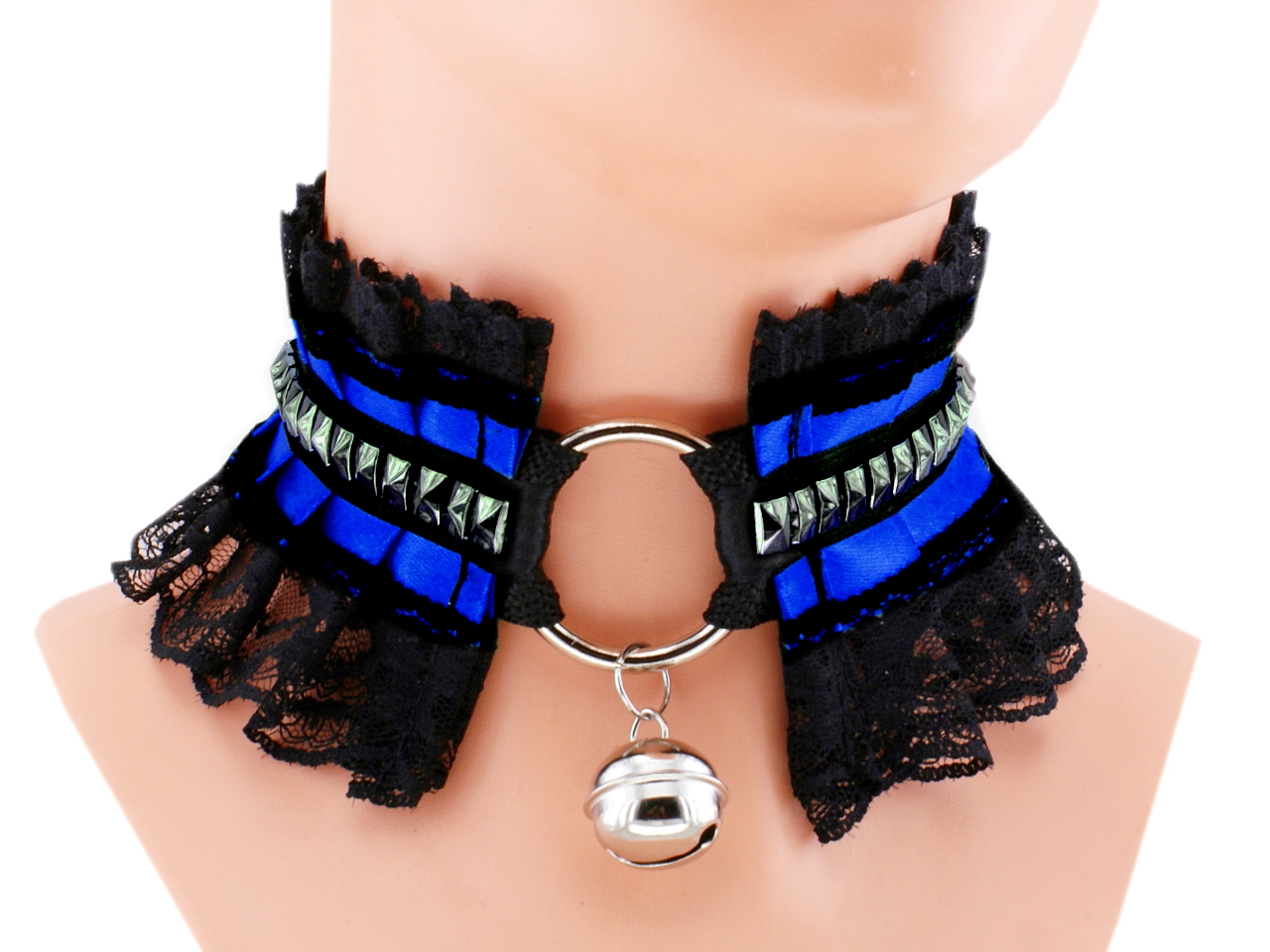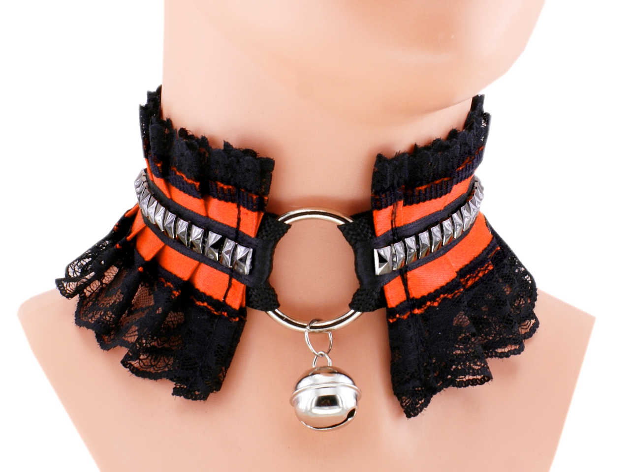Collar is made layers of fabric and decorative lace. Details are made of metal, and satin ribbon, bells. Lace is only on outer site.