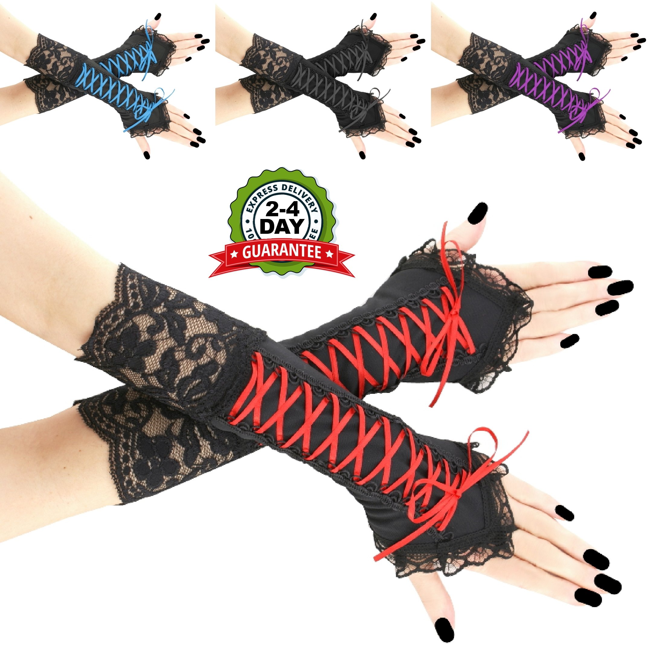 Black red fingerless gloves arm warmers gothic burlesque corset laced goth bride gloves womens evening gloves