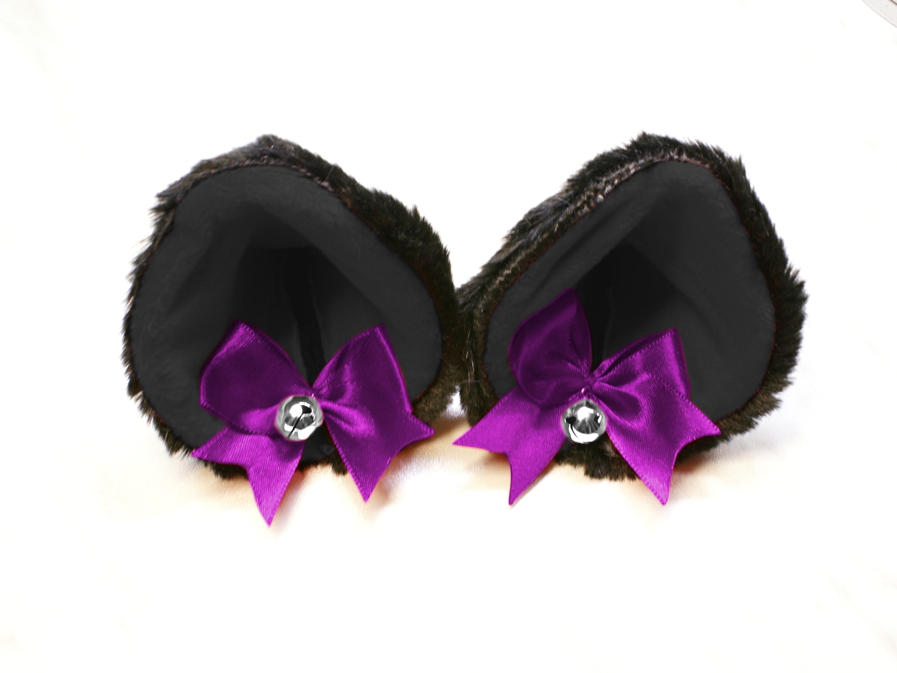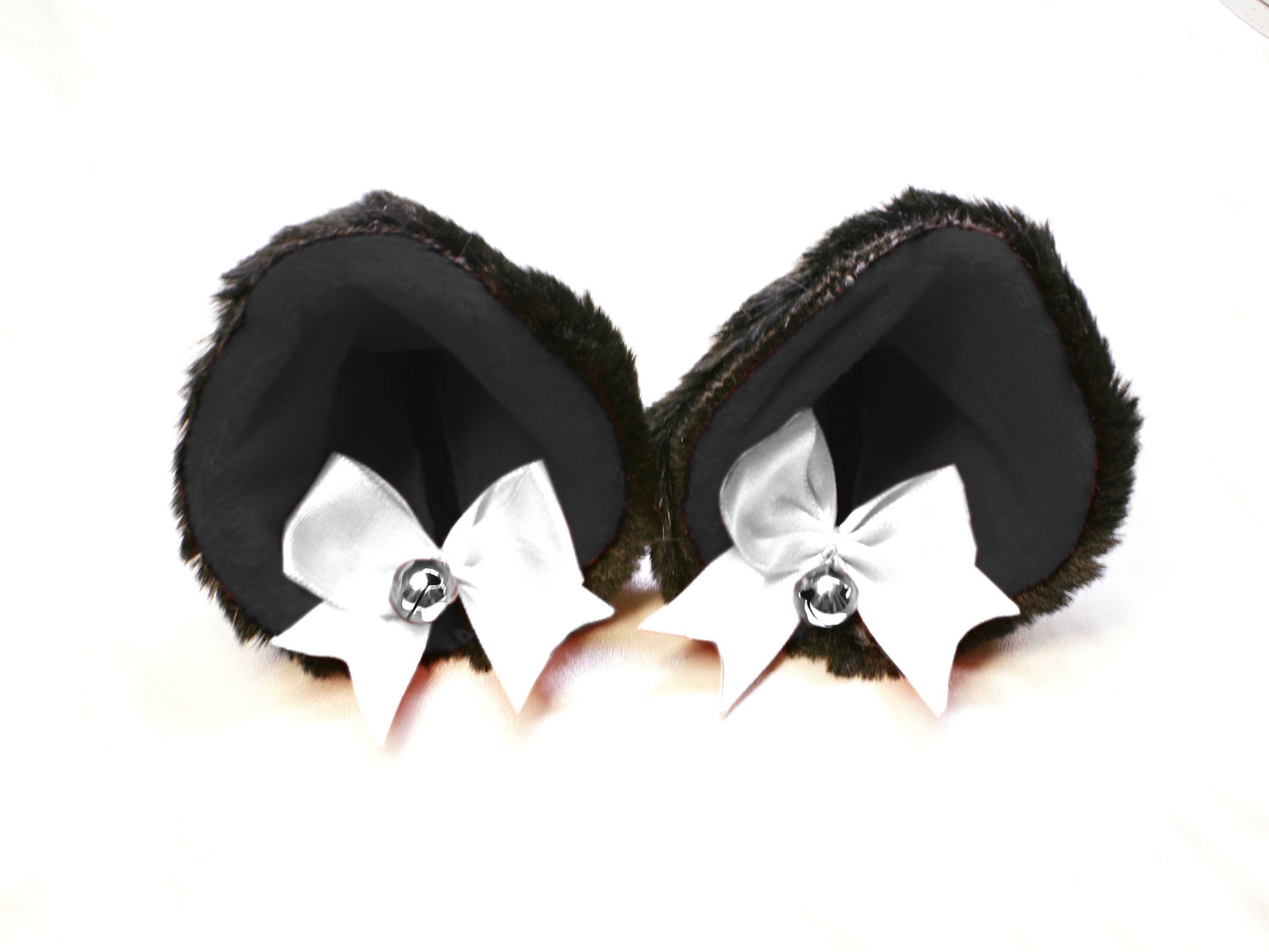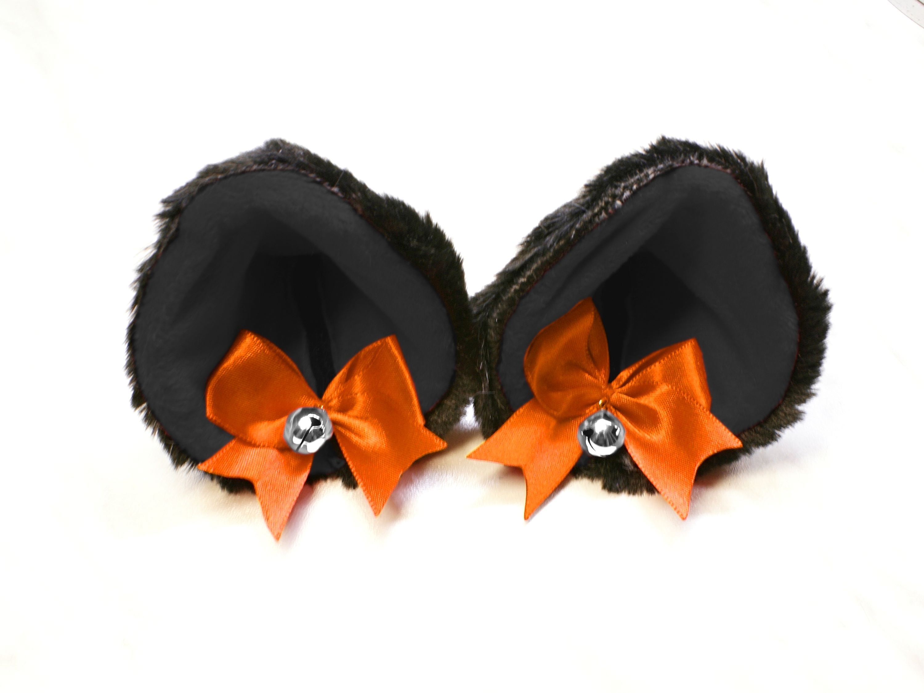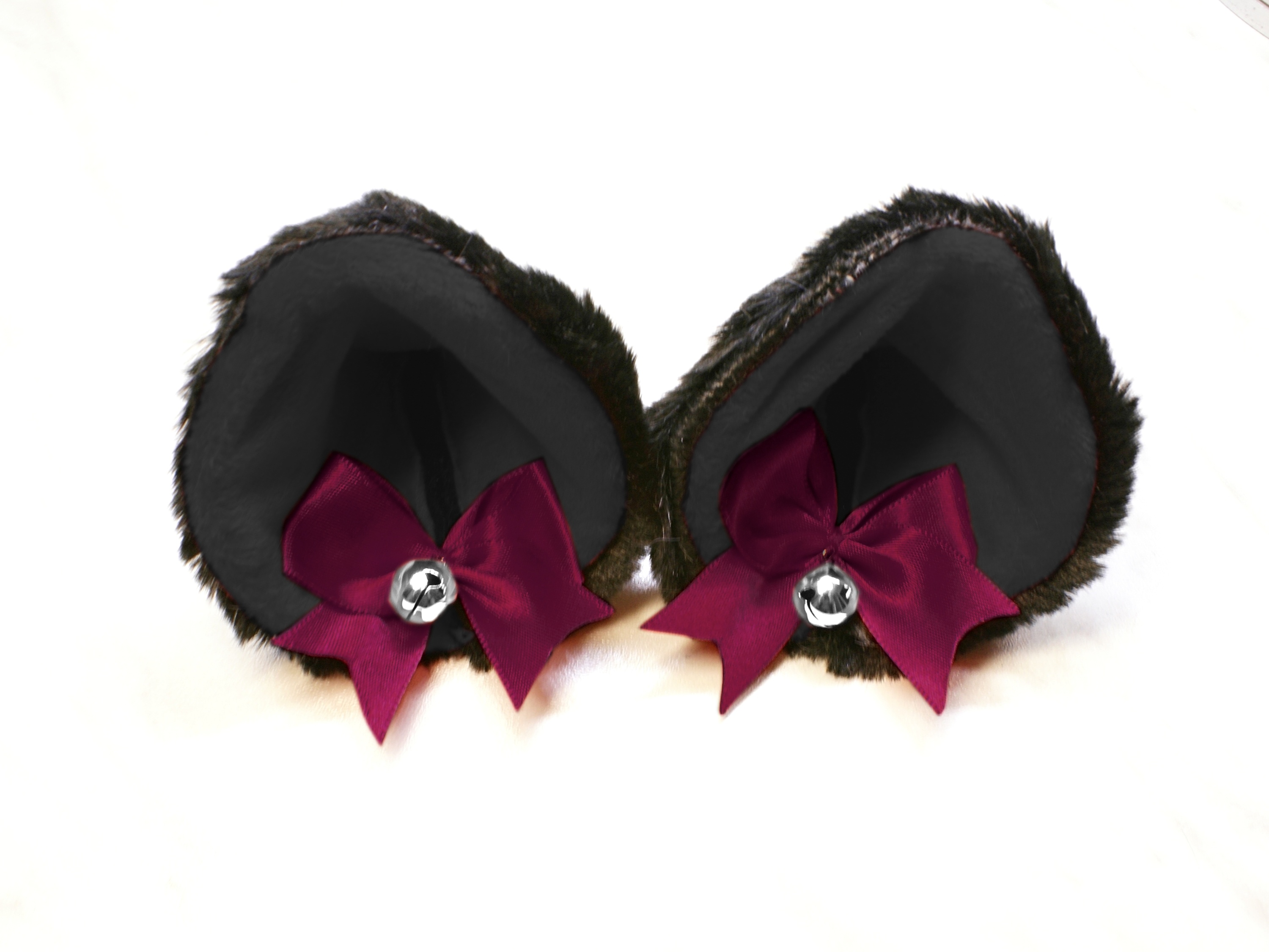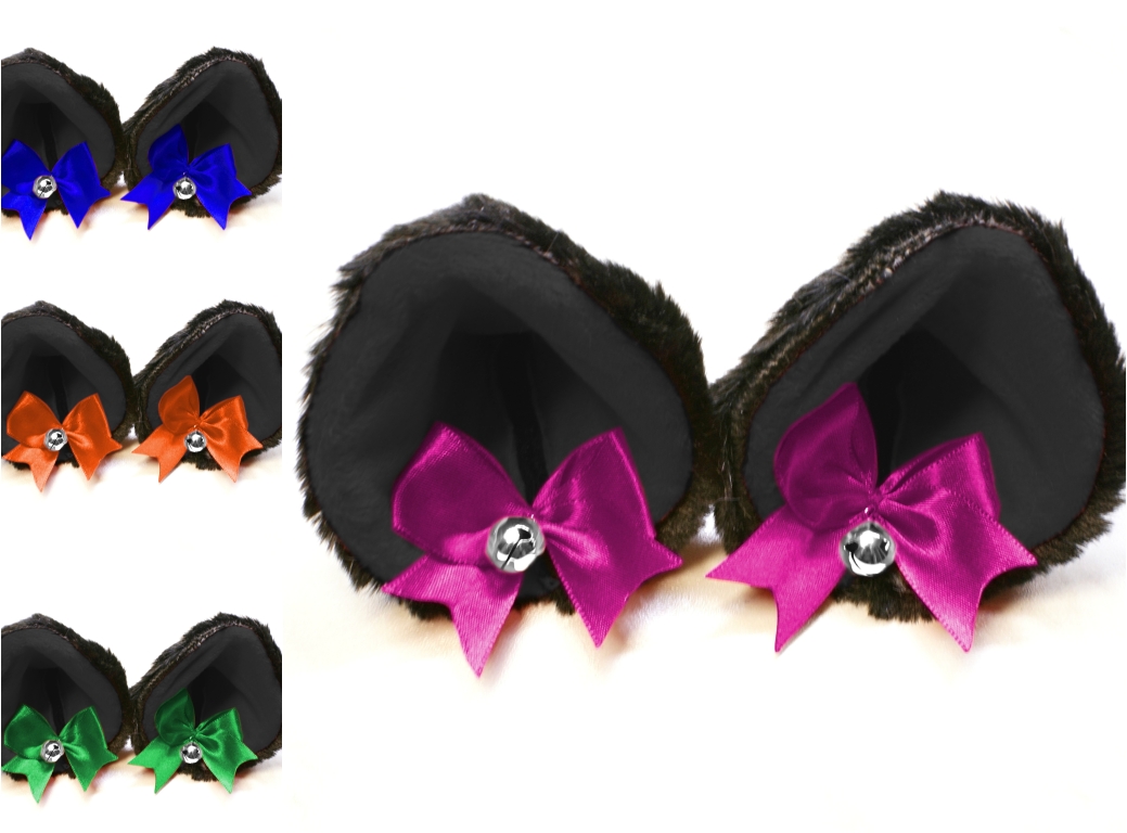 The ears are made of faux fur. Satin ribbons, as ornaments. A bell is attached to the ribbon. A metal clip for attaching the ears is attached to the underside of the ears. Added metal headband so that the ears can be attached to the headband. So you have more options for wearing ears. You can wear them in several ways.