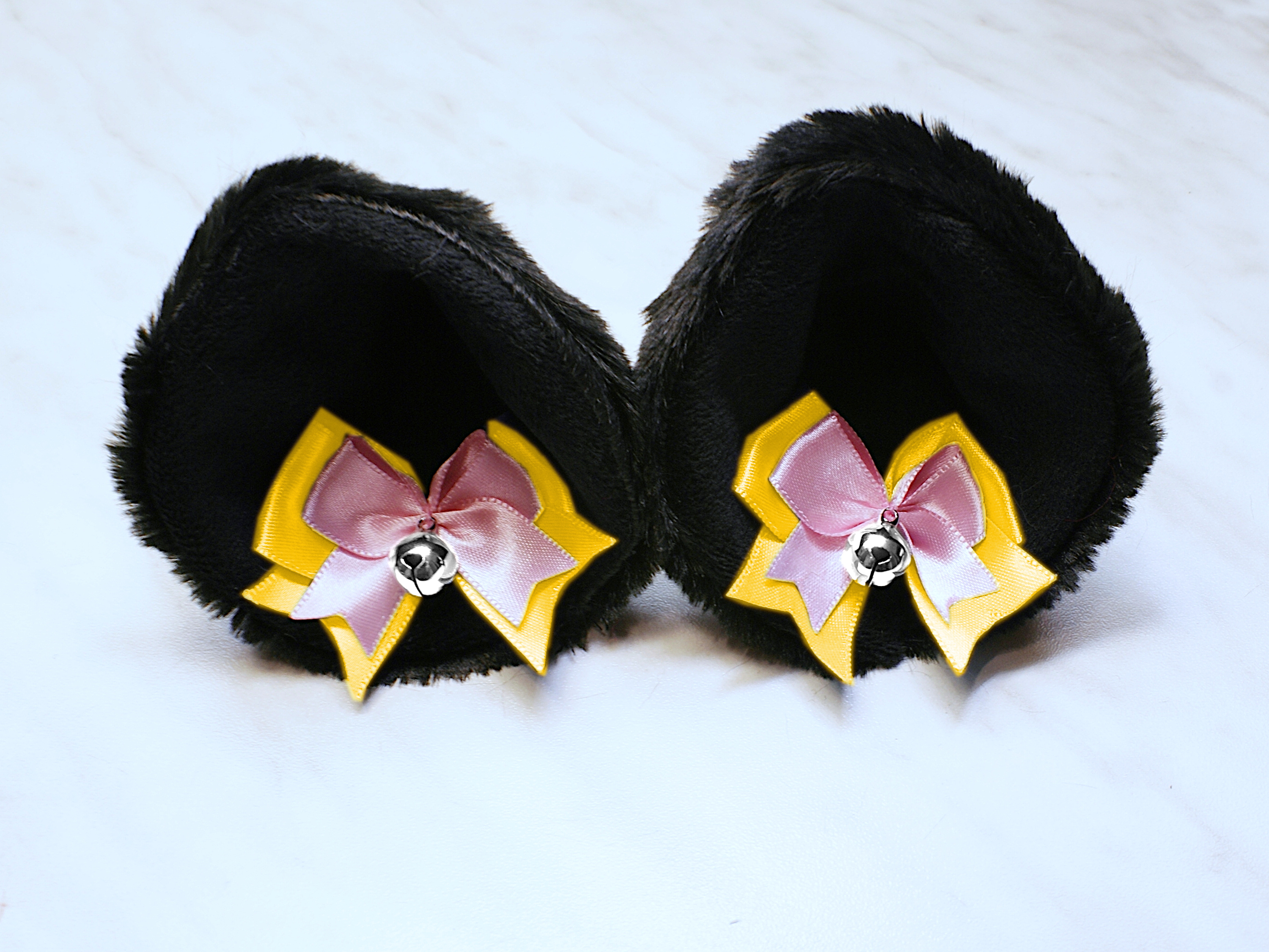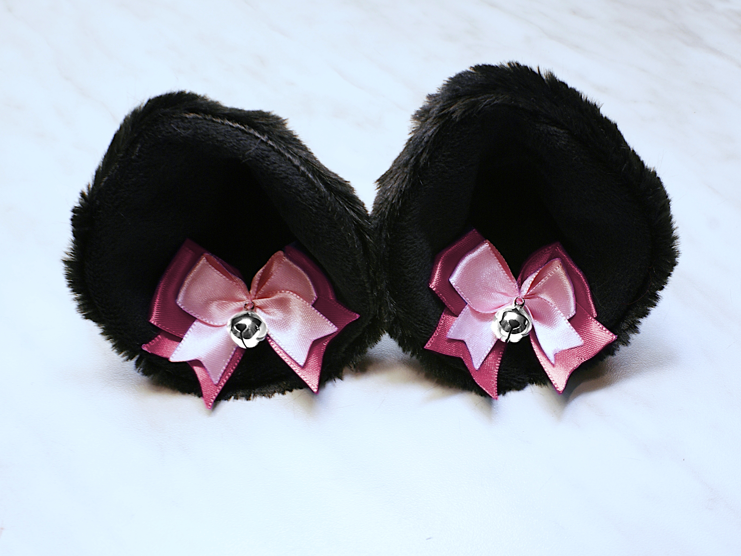 The ears are made of faux fur. Satin ribbons, as ornaments. A bell is attached to the ribbon. A metal clip for attaching the ears is attached to the underside of the ears. Added metal headband so that the ears can be attached to the headband. So you have more options for wearing ears. You can wear them in several ways.