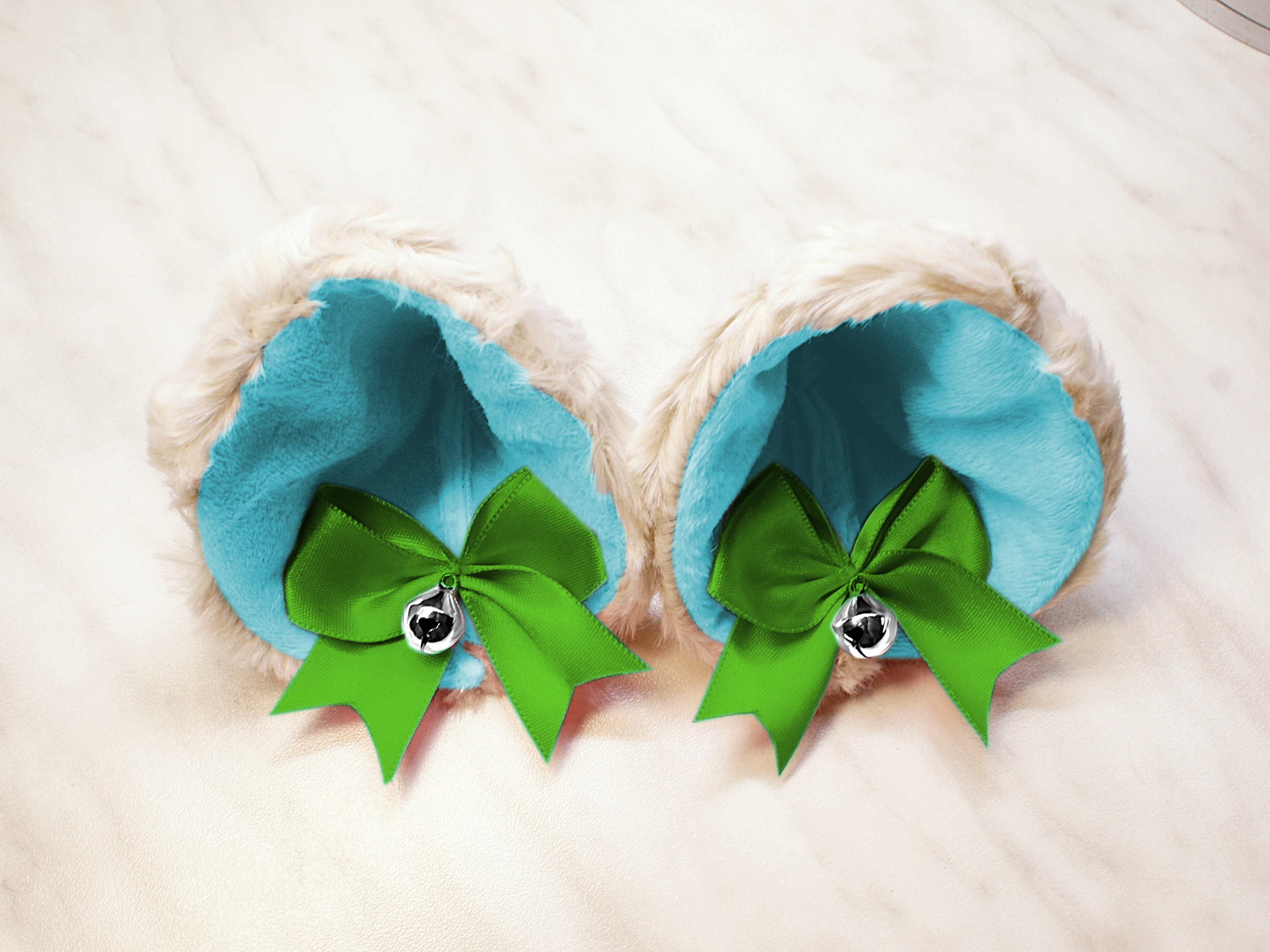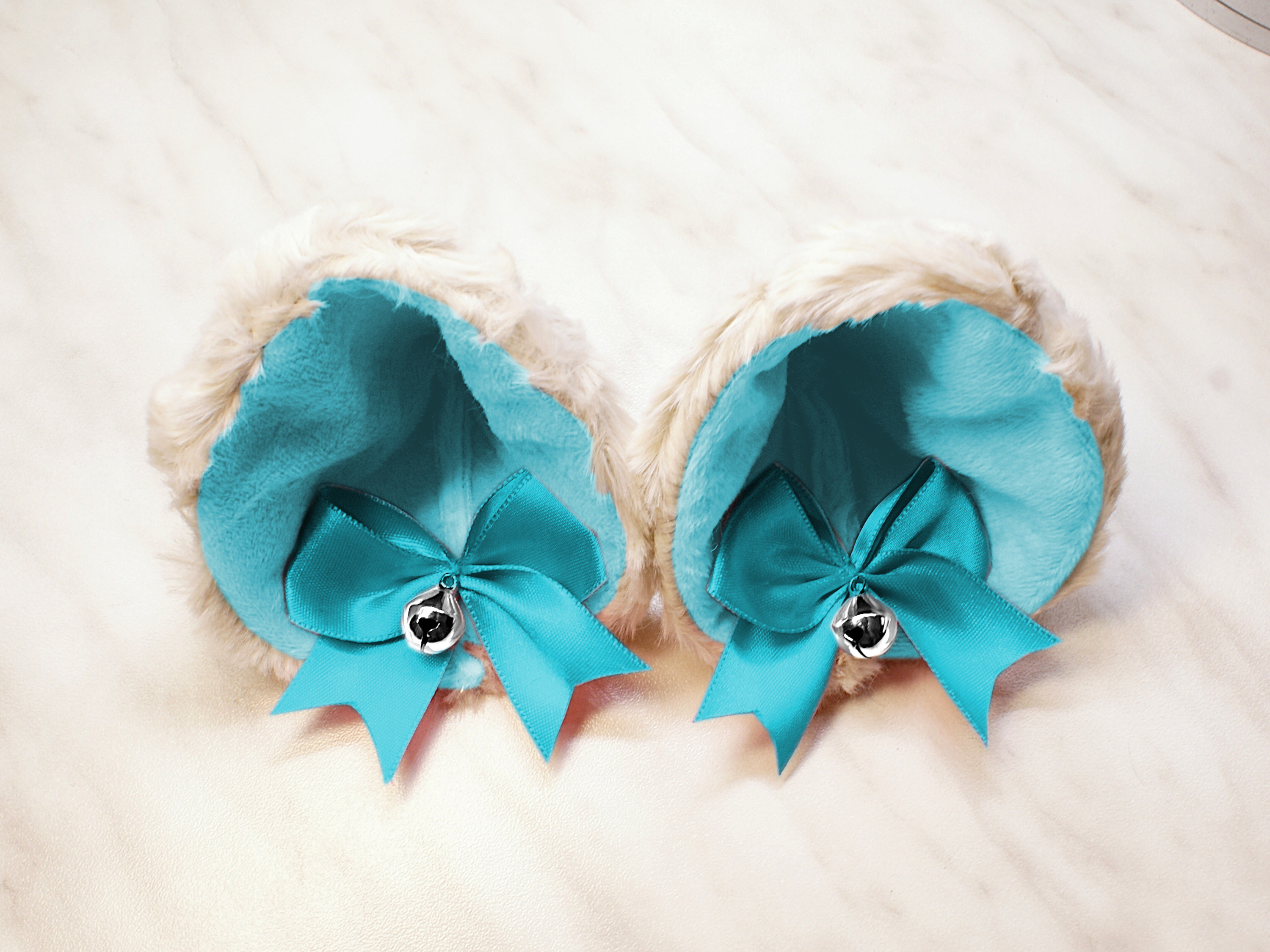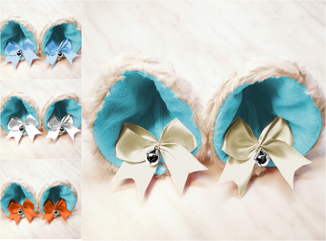 The ears are made of faux fur. Satin ribbons, as ornaments. A bell is attached to the ribbon. A metal clip for attaching the ears is attached to the underside of the ears. Added metal headband so that the ears can be attached to the headband. So you have more options for wearing ears. You can wear them in several ways.