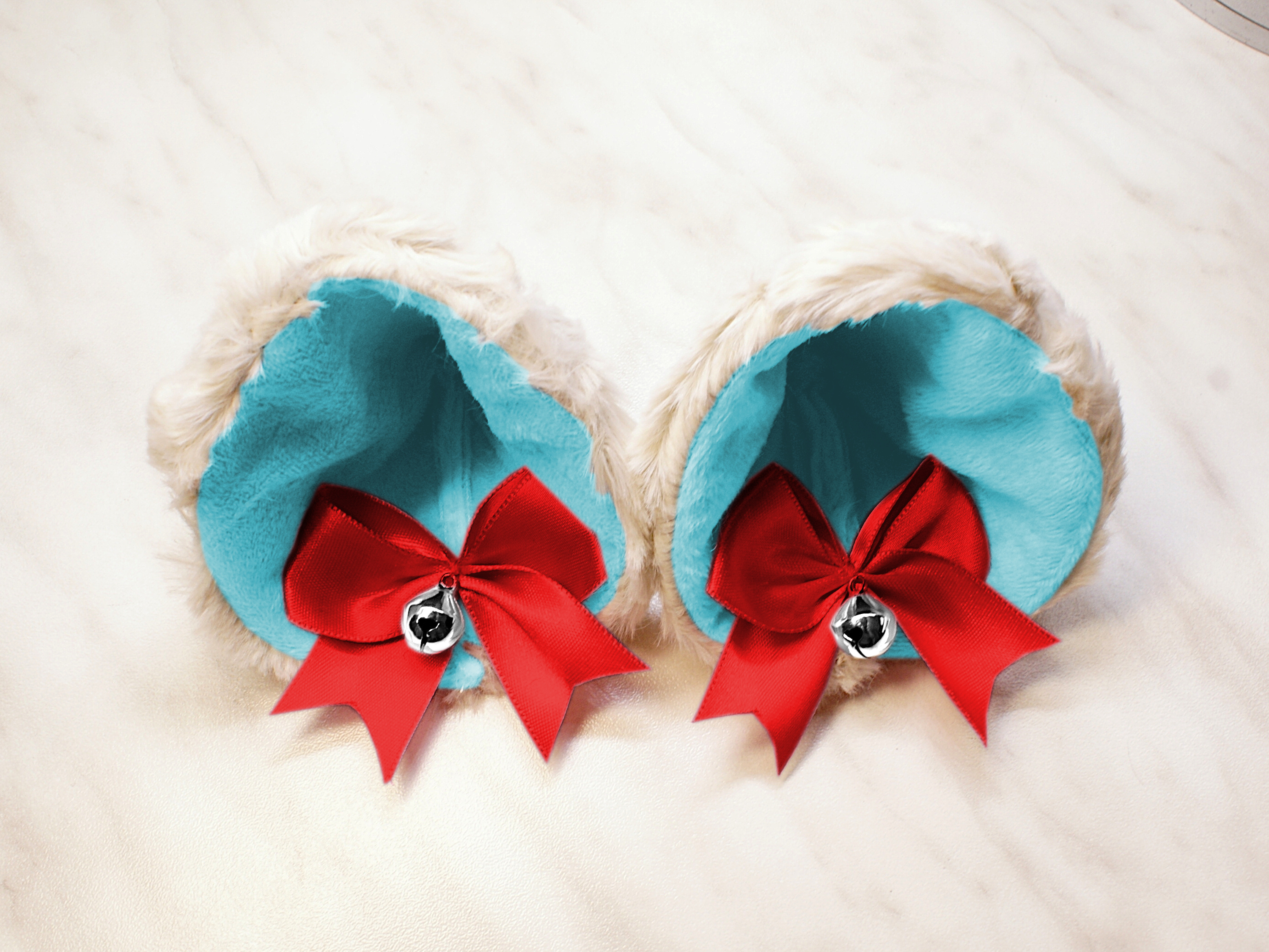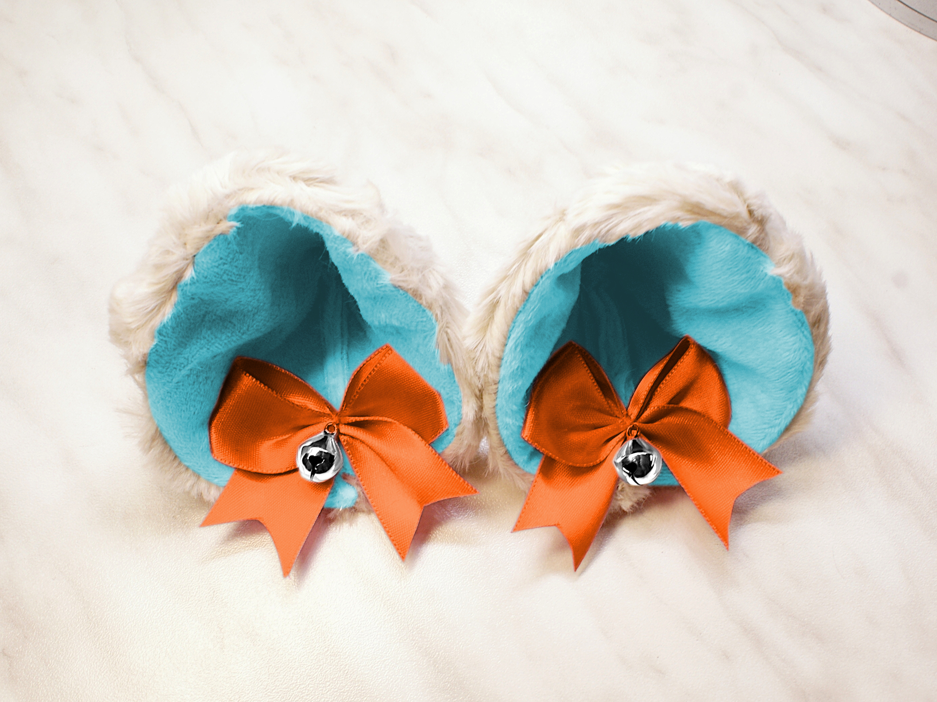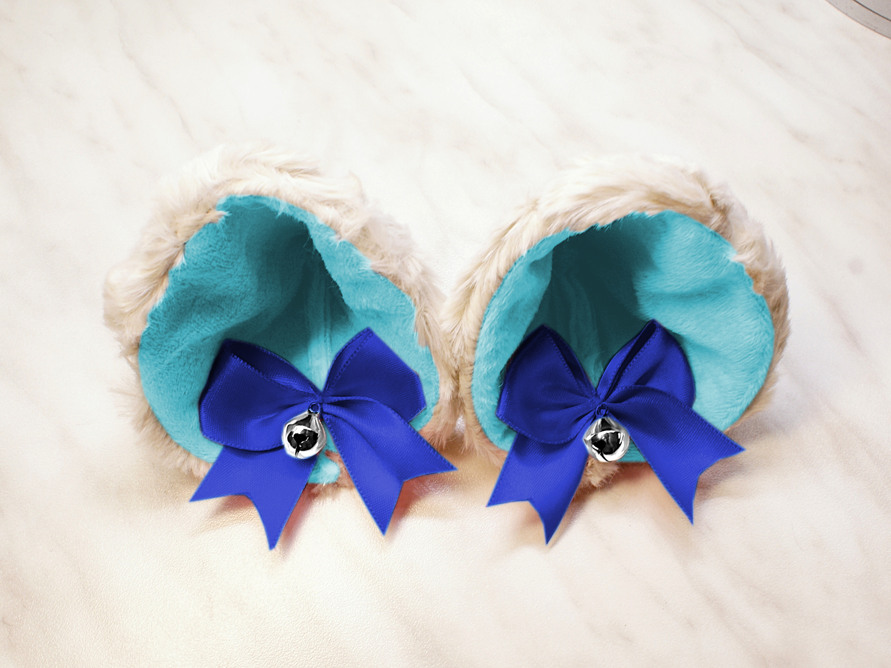 The ears are made of faux fur. Satin ribbons, as ornaments. A bell is attached to the ribbon. A metal clip for attaching the ears is attached to the underside of the ears. Added metal headband so that the ears can be attached to the headband. So you have more options for wearing ears. You can wear them in several ways.