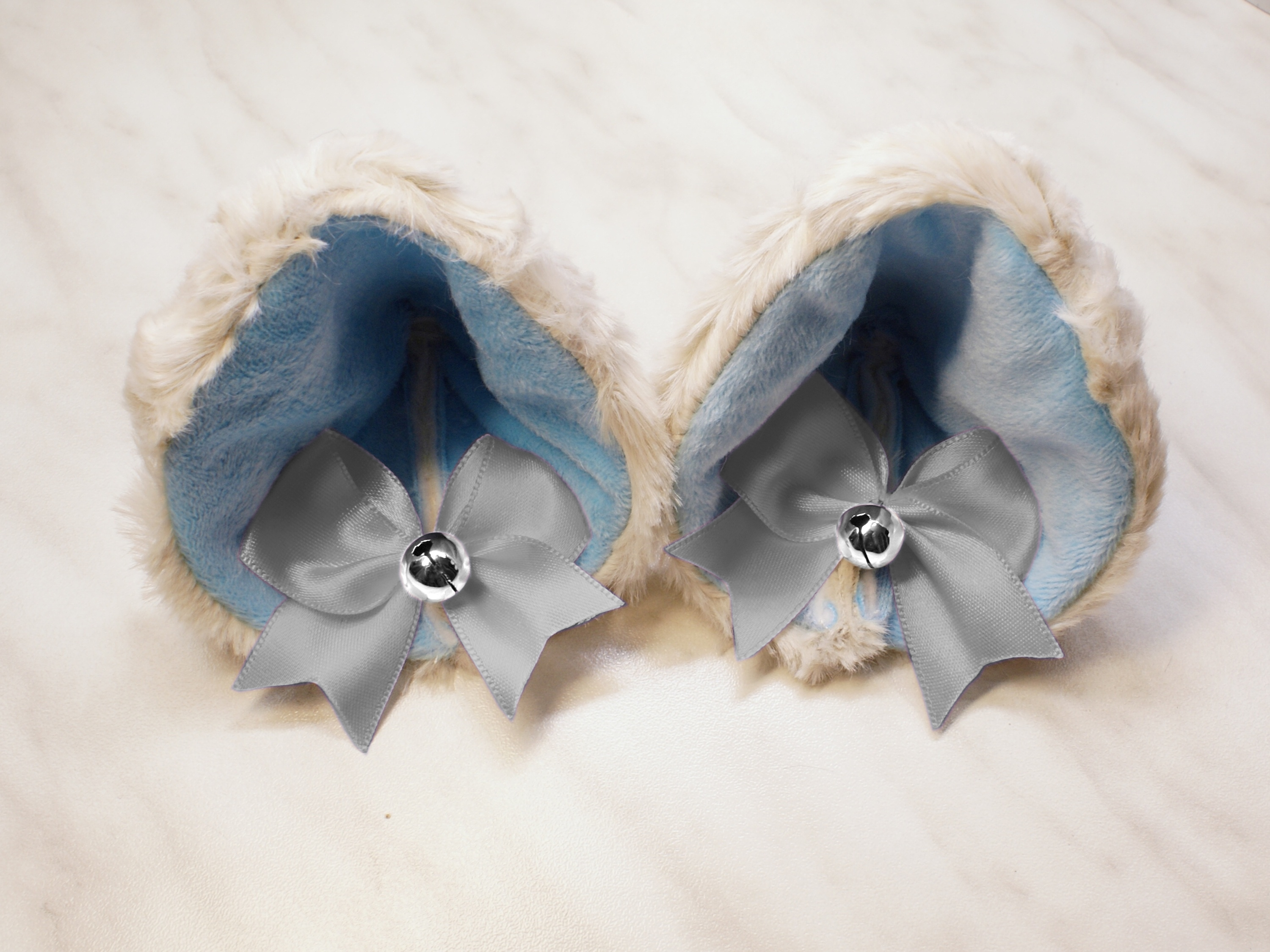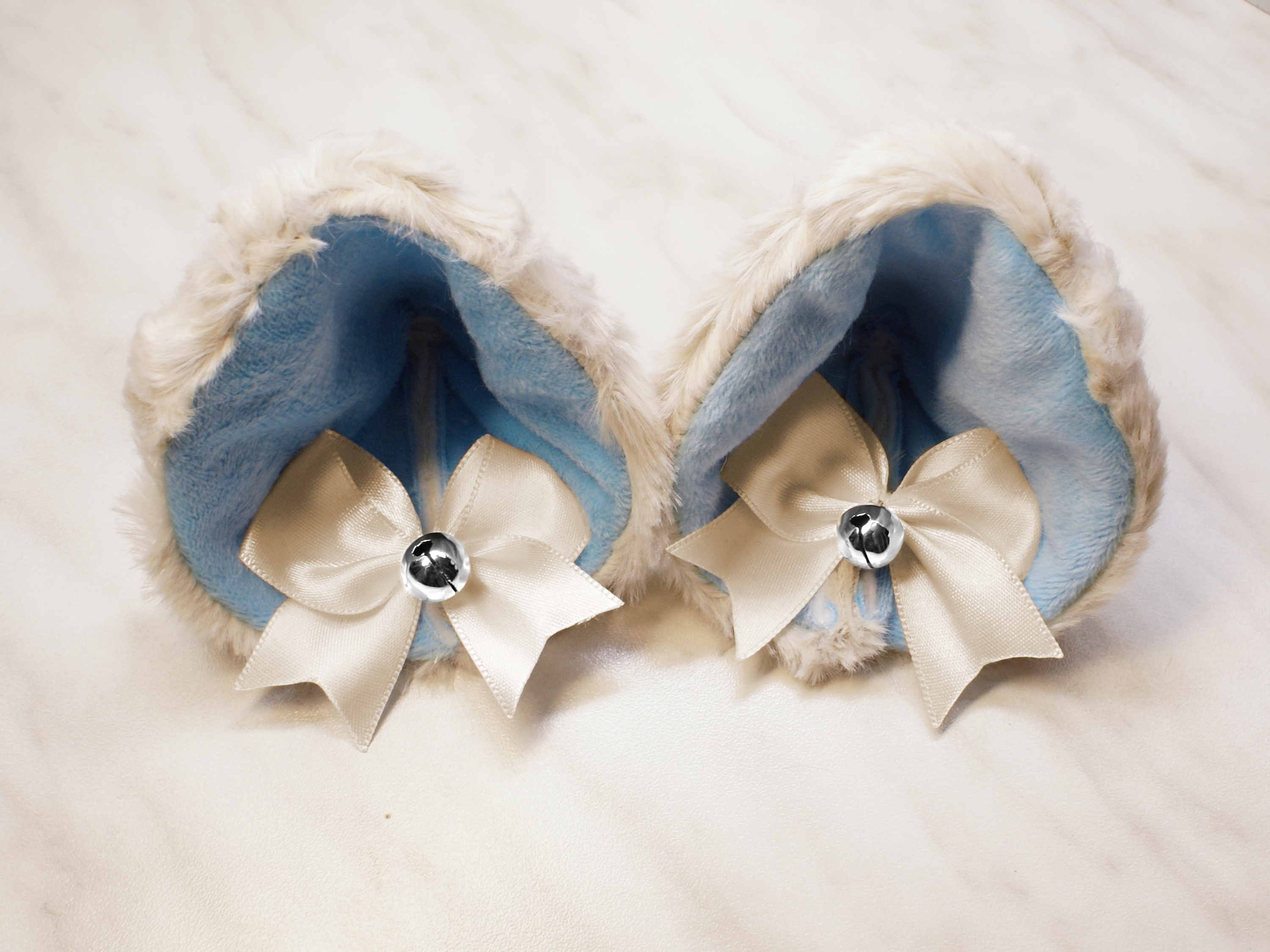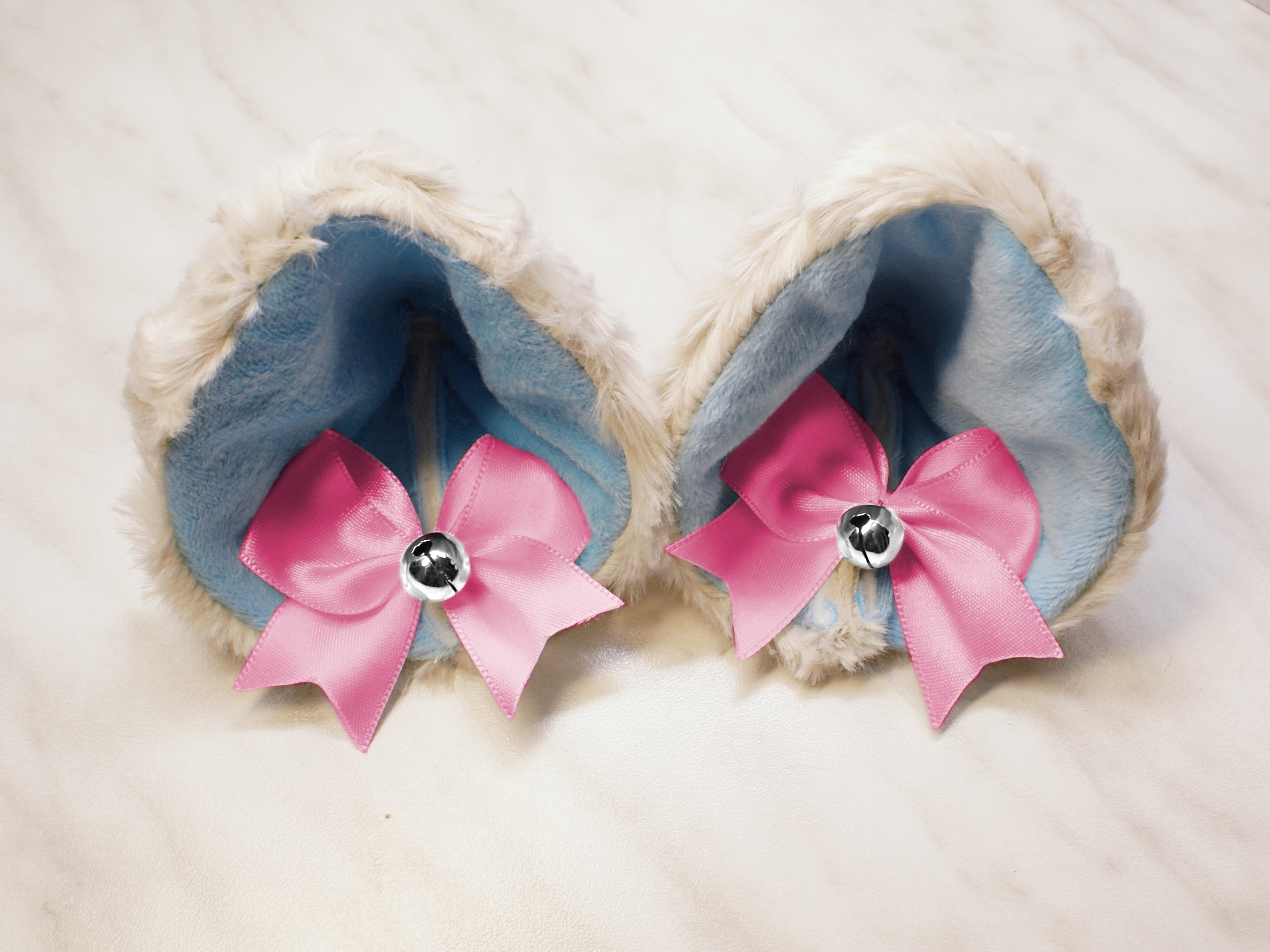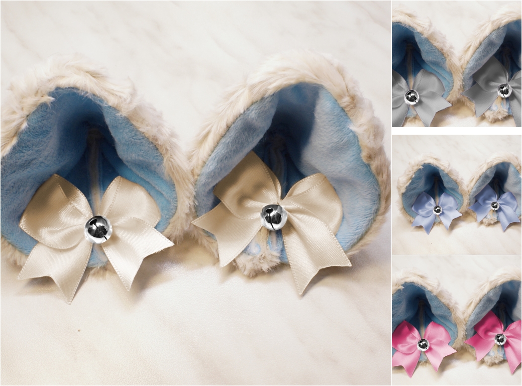 The ears are made of faux fur. Satin ribbons, as ornaments. A bell is attached to the ribbon. A metal clip for attaching the ears is attached to the underside of the ears. Added metal headband so that the ears can be attached to the headband. So you have more options for wearing ears. You can wear them in several ways.