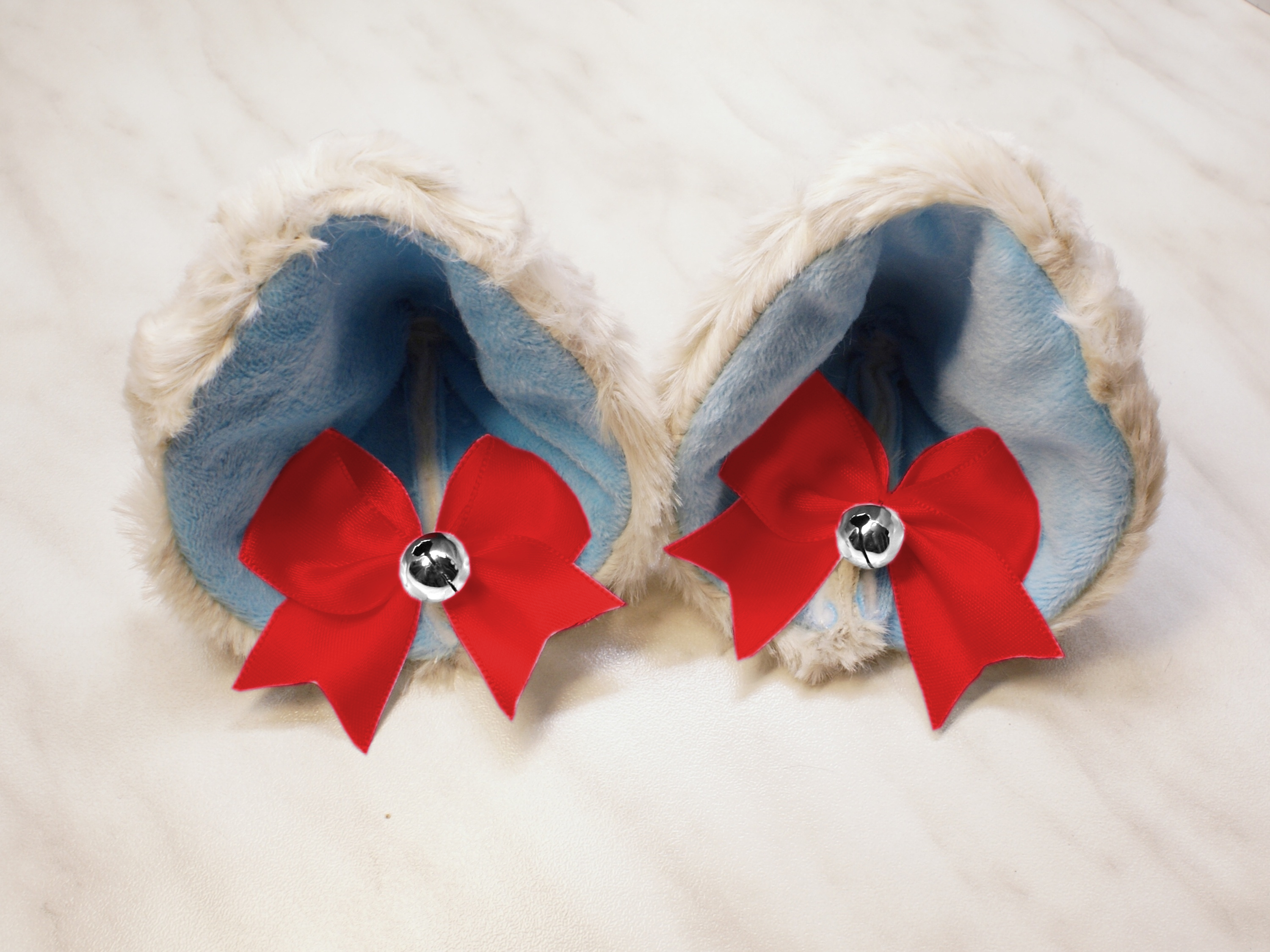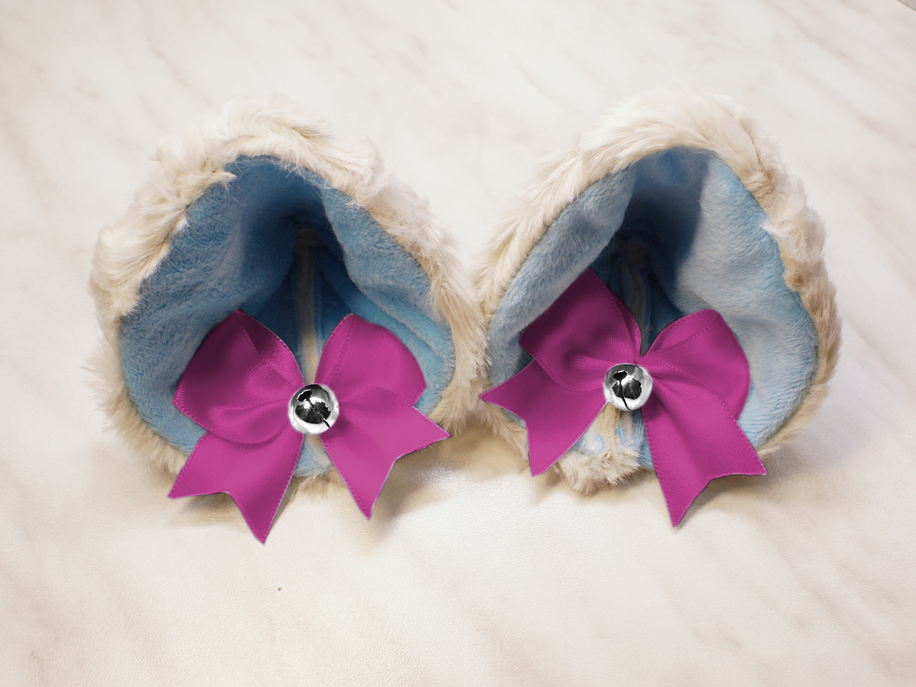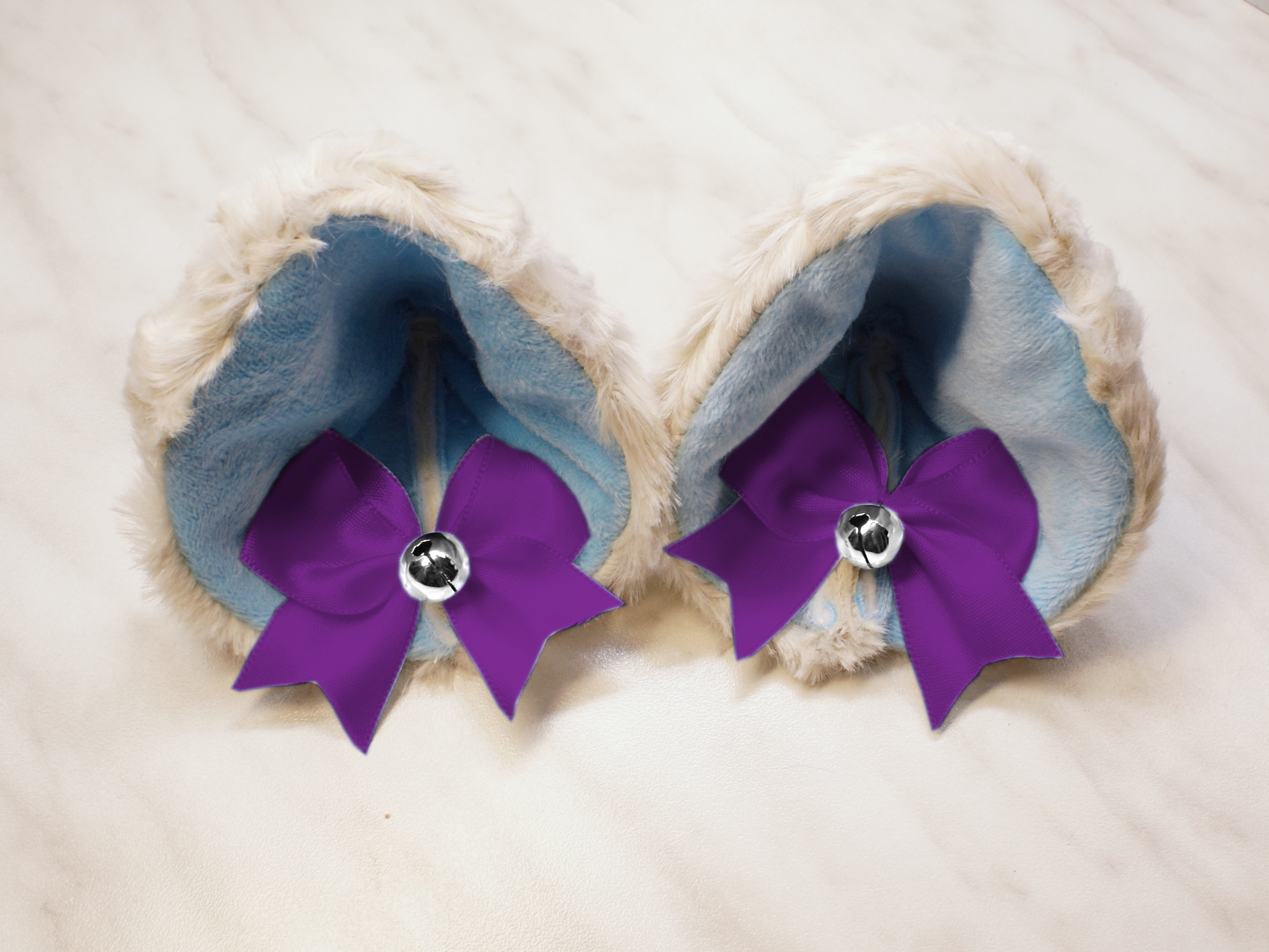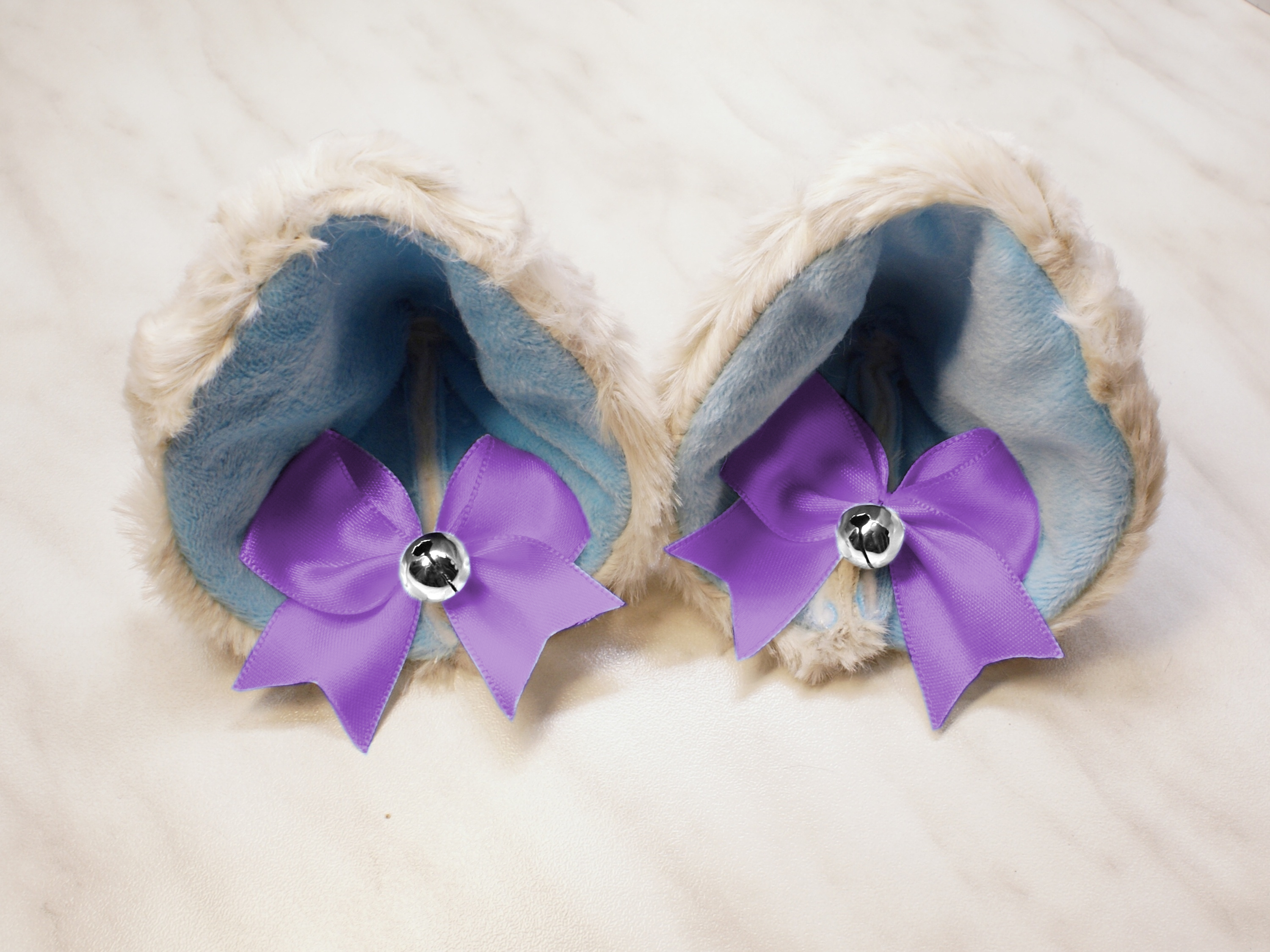 The ears are made of faux fur. Satin ribbons, as ornaments. A bell is attached to the ribbon. A metal clip for attaching the ears is attached to the underside of the ears. Added metal headband so that the ears can be attached to the headband. So you have more options for wearing ears. You can wear them in several ways.