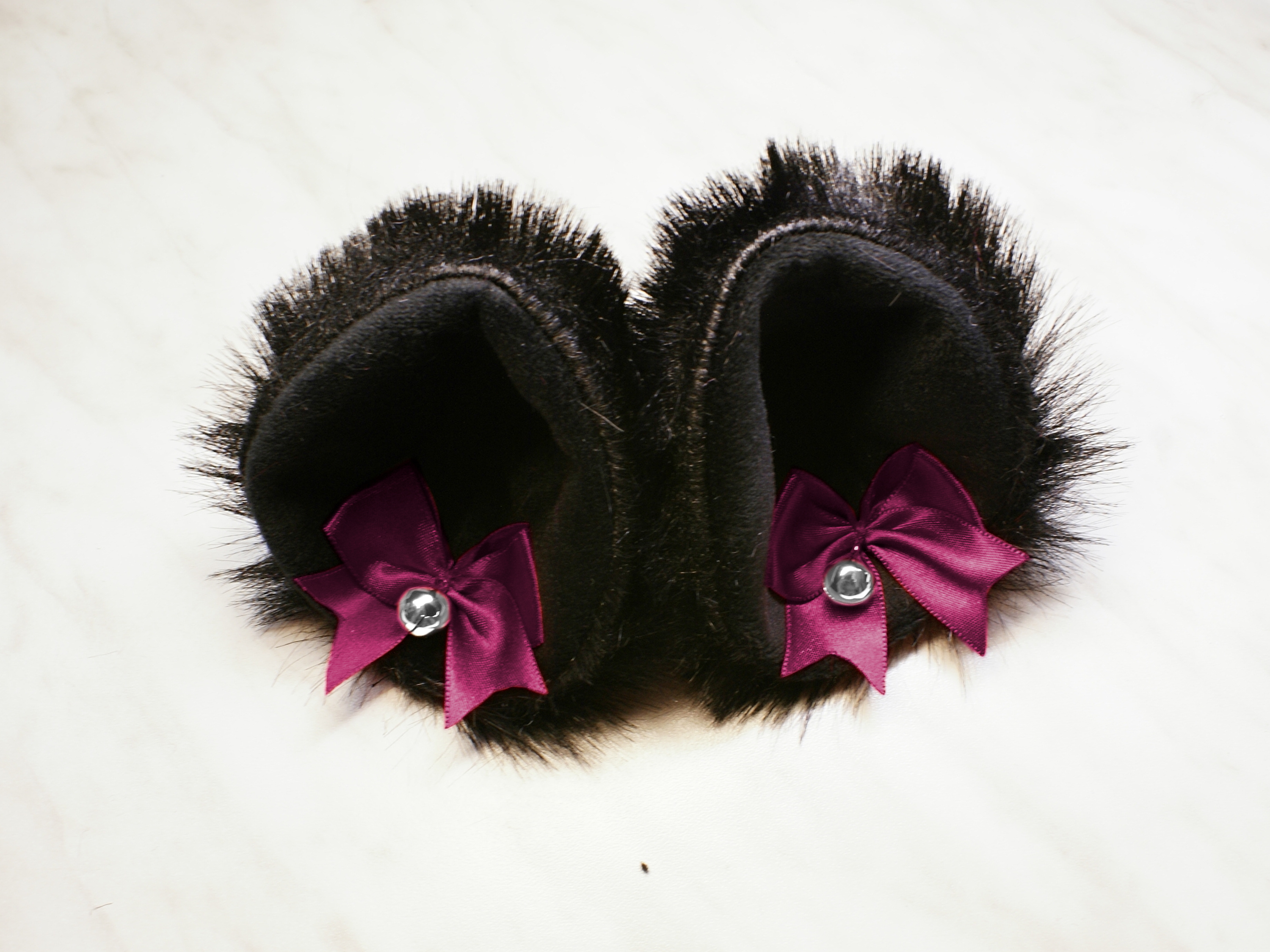 The ears are made of faux fur. Satin ribbons, as ornaments. A bell is attached to the ribbon. A metal clip for attaching the ears is attached to the underside of the ears. Added metal headband so that the ears can be attached to the headband. So you have more options for wearing ears. You can wear them in several ways.