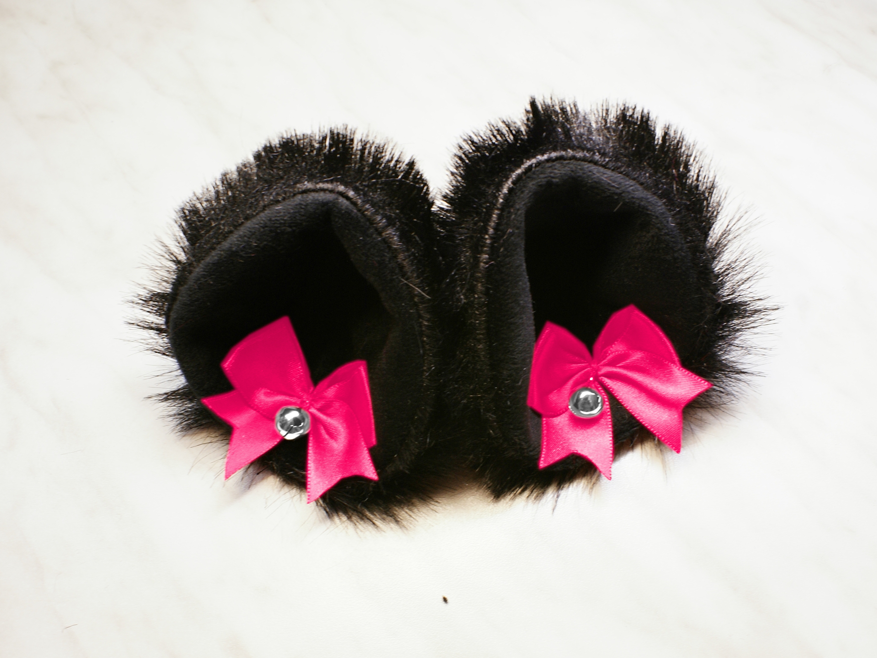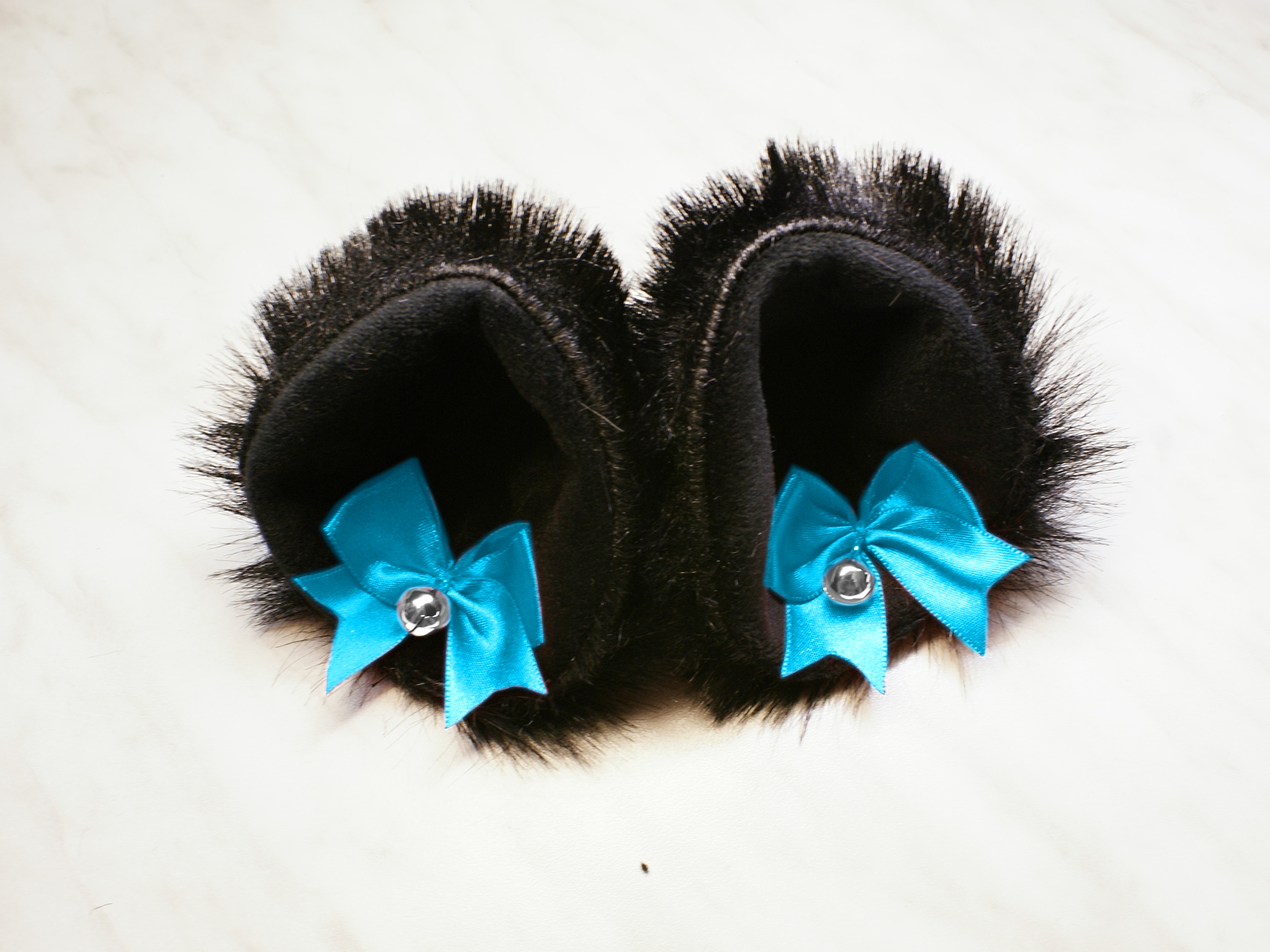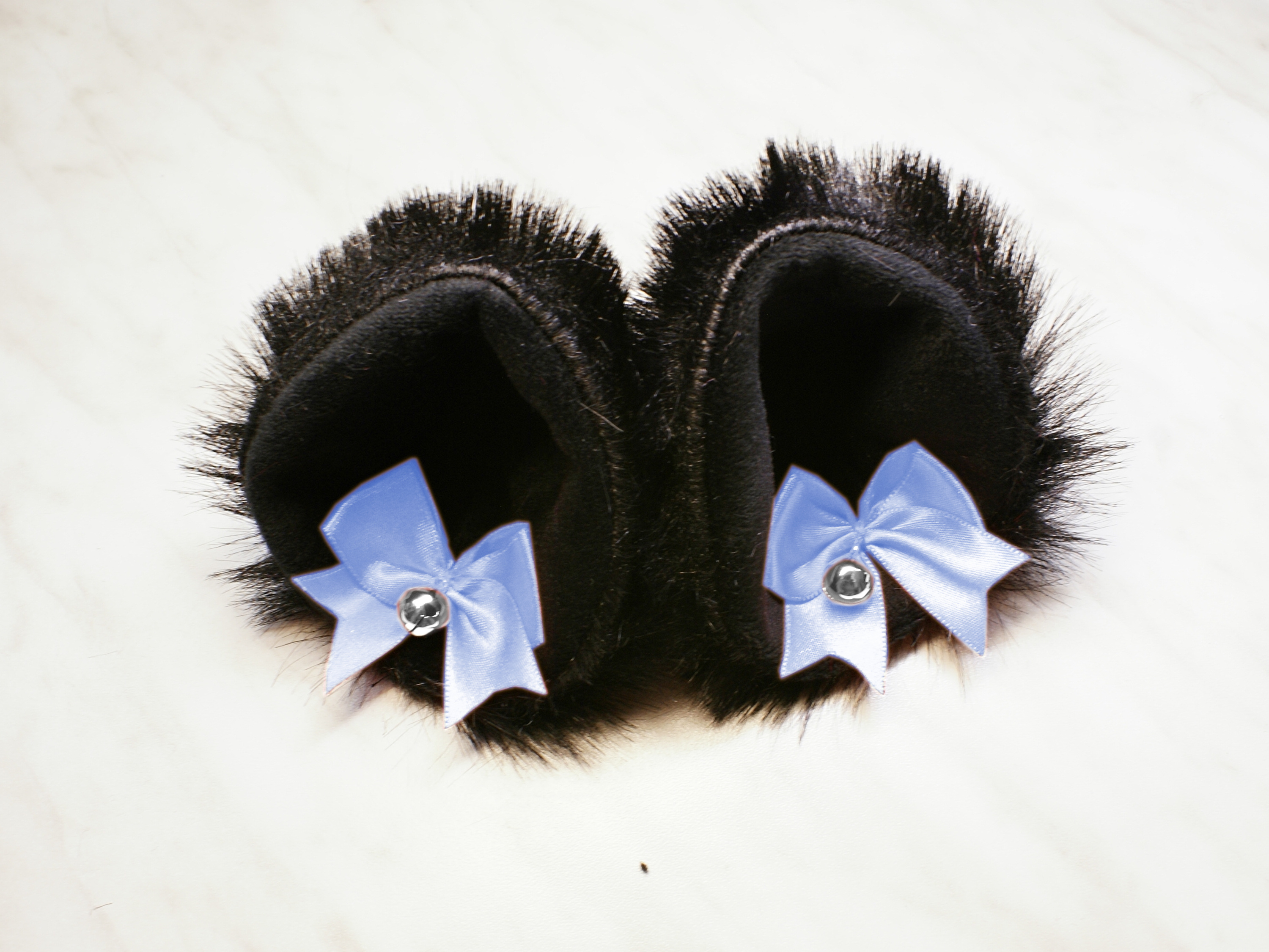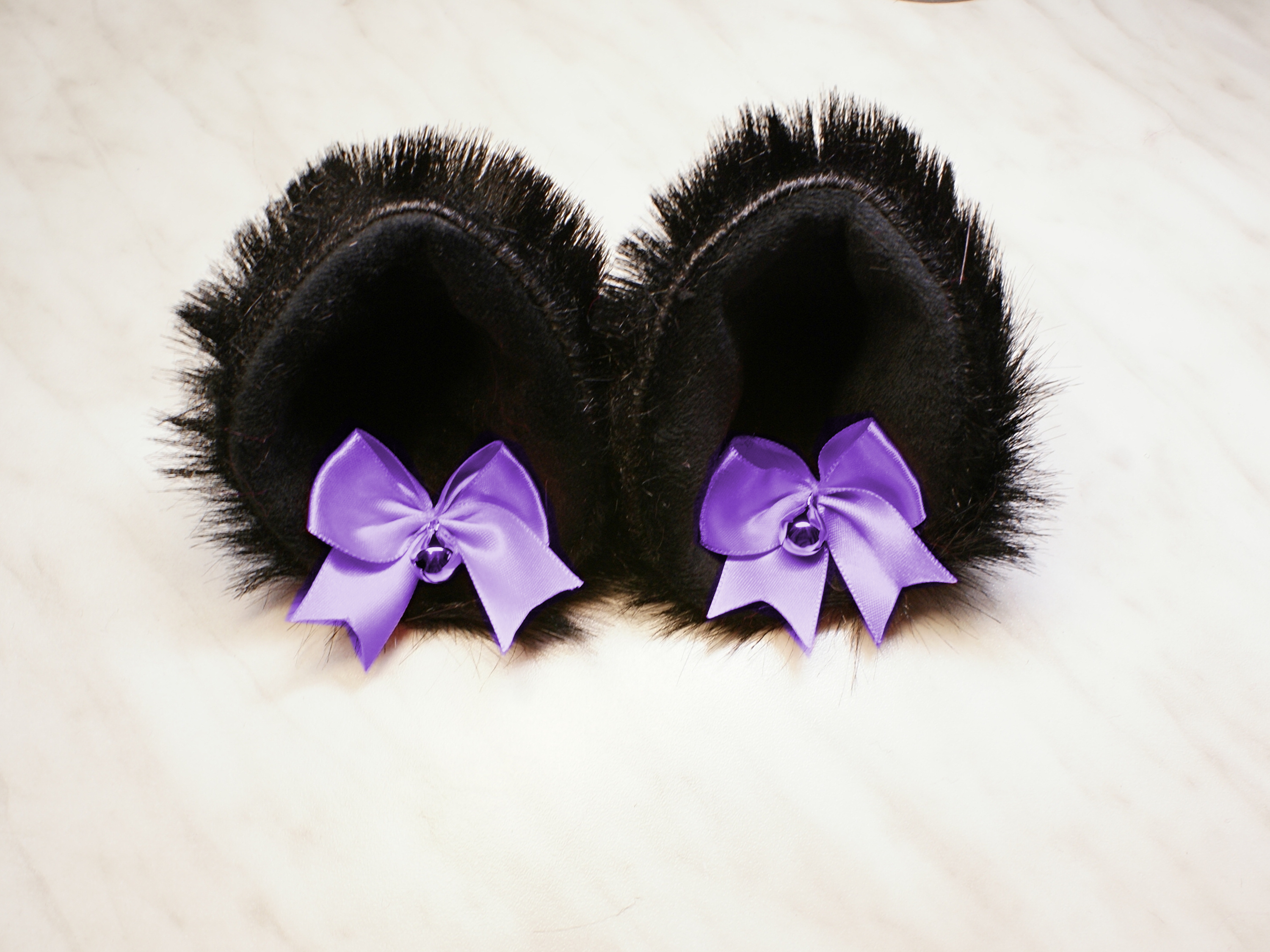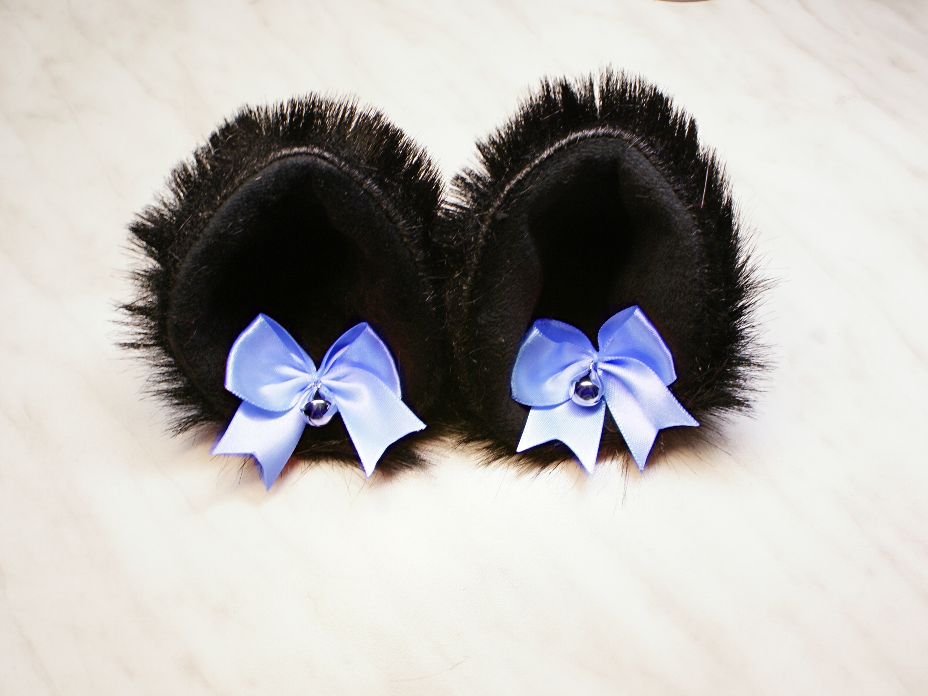 The ears are made of faux fur. Satin ribbons, as ornaments. A bell is attached to the ribbon. A metal clip for attaching the ears is attached to the underside of the ears. Added metal headband so that the ears can be attached to the headband. So you have more options for wearing ears. You can wear them in several ways.