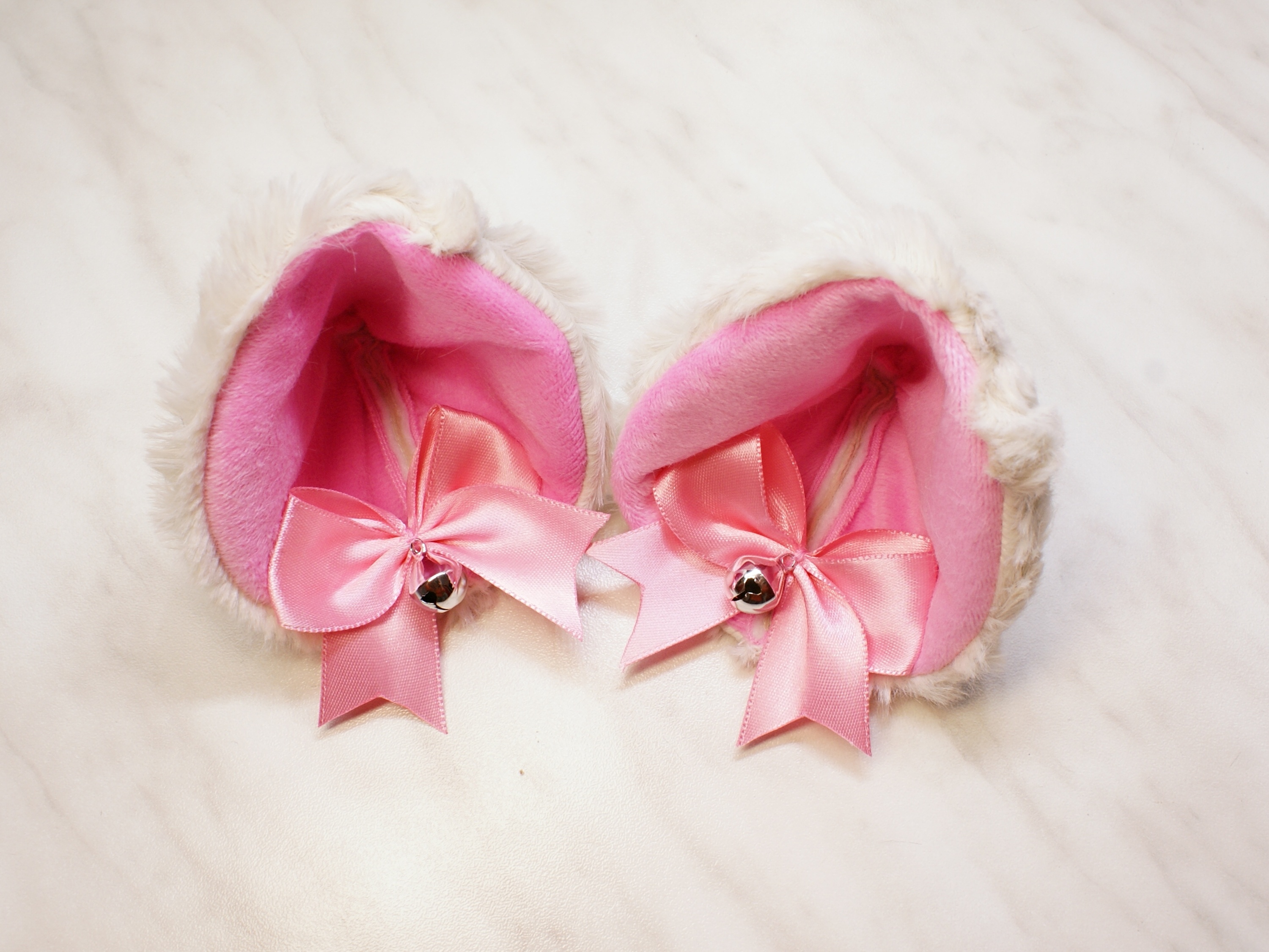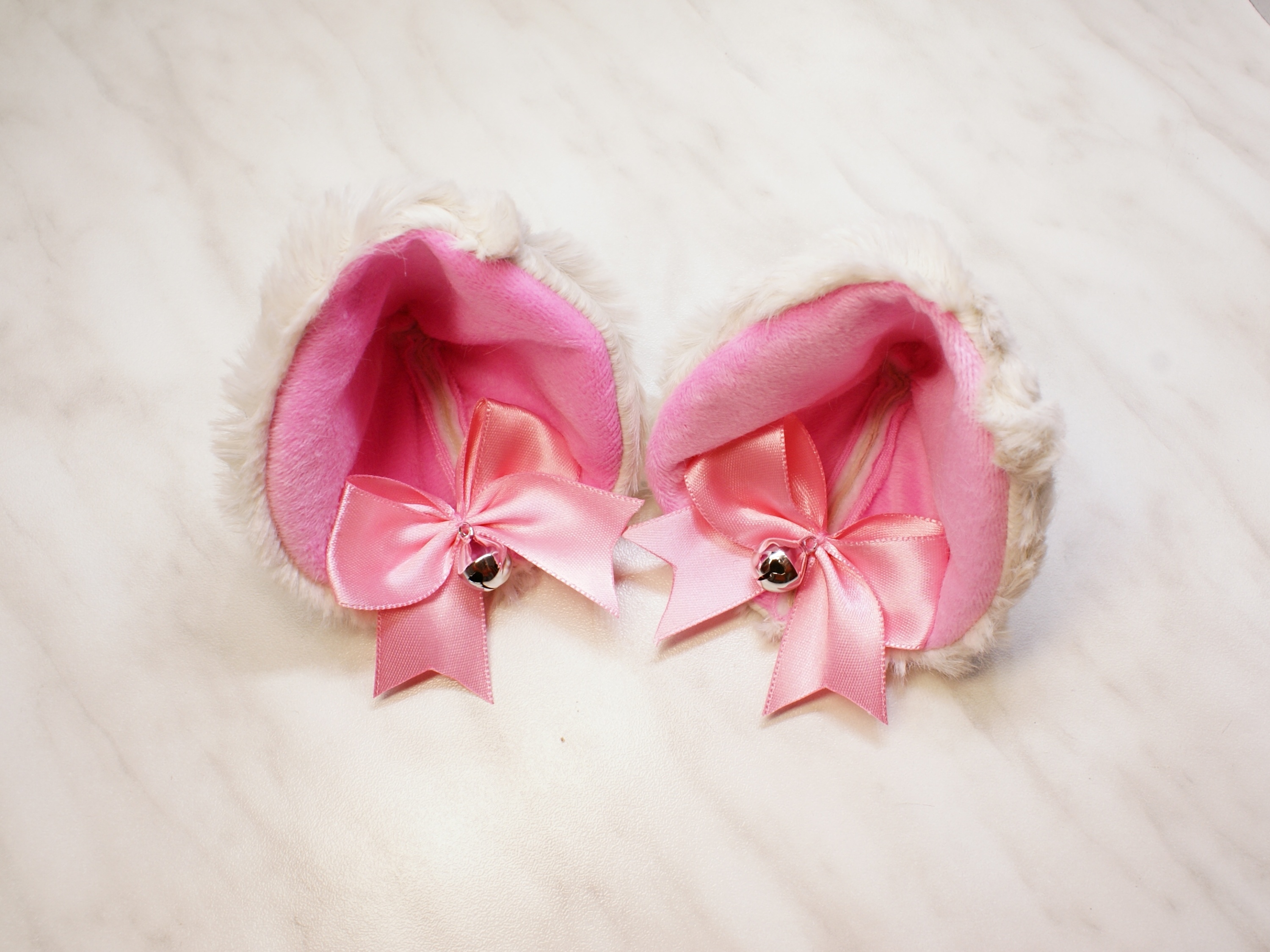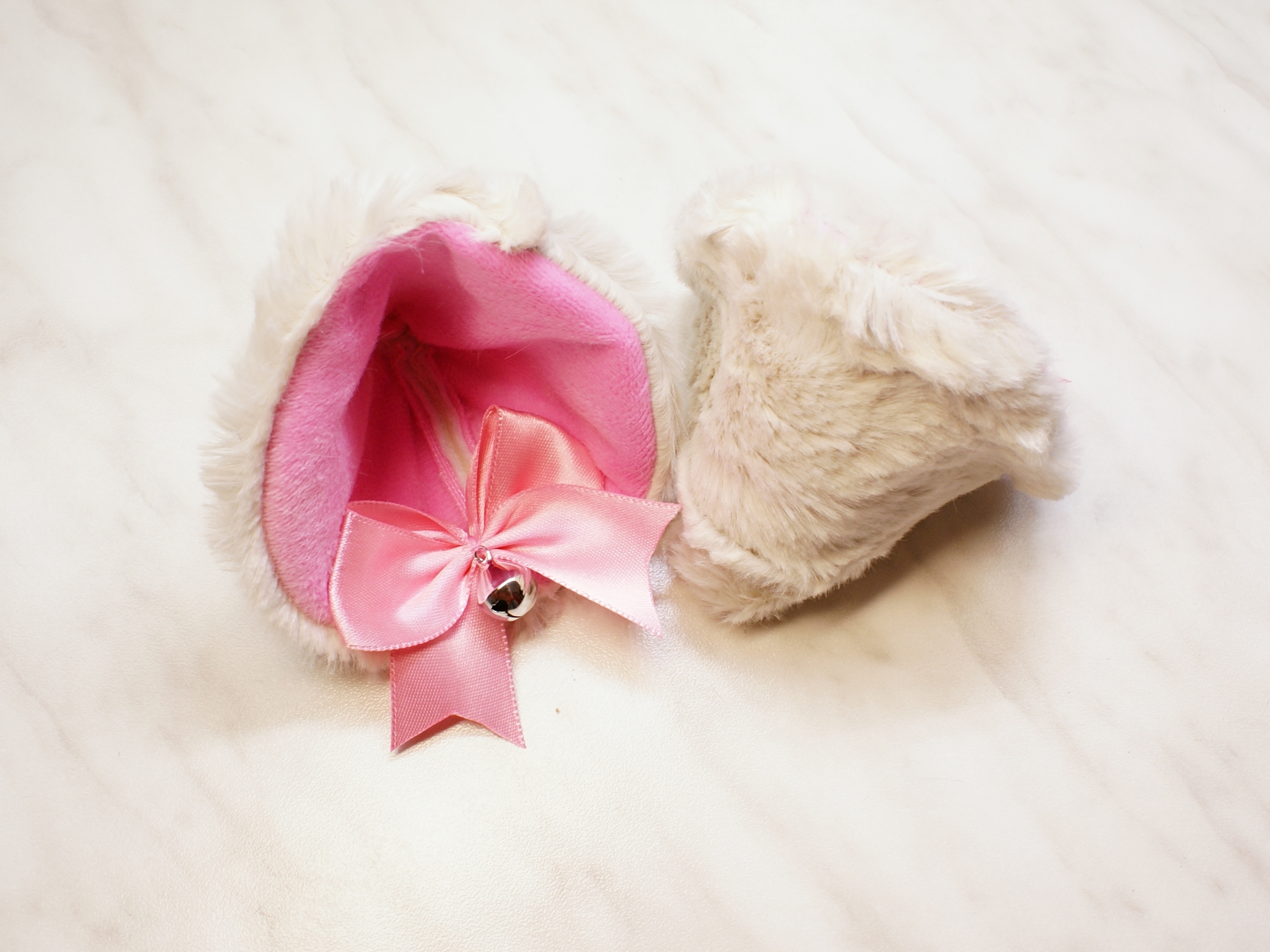 The ears are made of faux fur. Satin ribbons, as ornaments. A bell is attached to the ribbon. A metal clip for attaching the ears is attached to the underside of the ears. Added metal headband so that the ears can be attached to the headband. So you have more options for wearing ears. You can wear them in several ways.