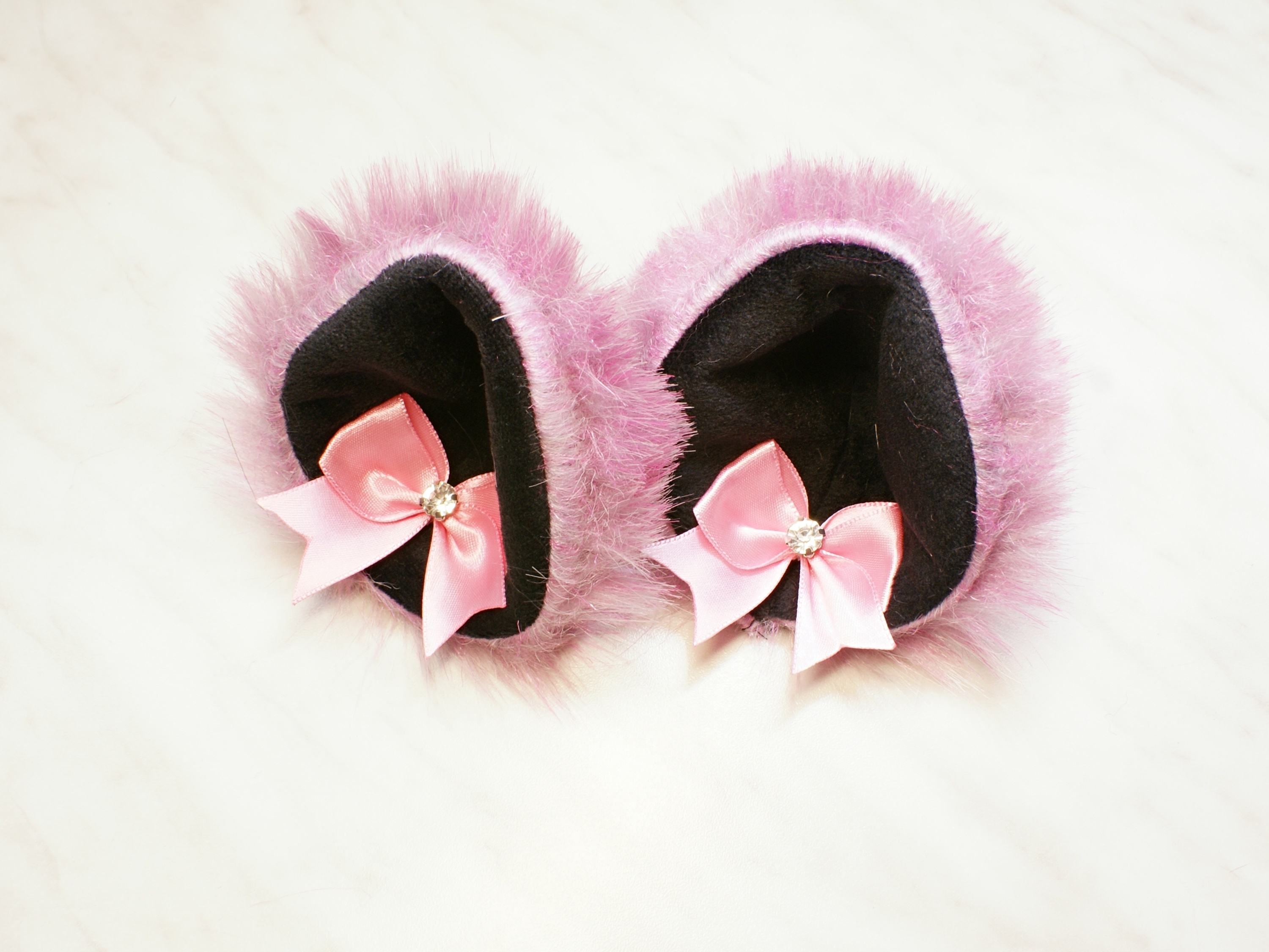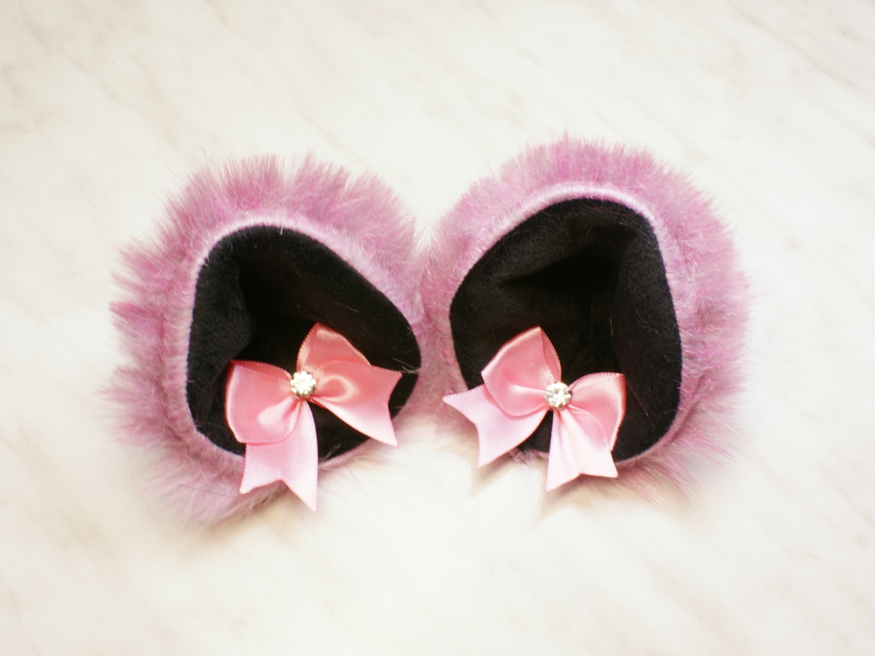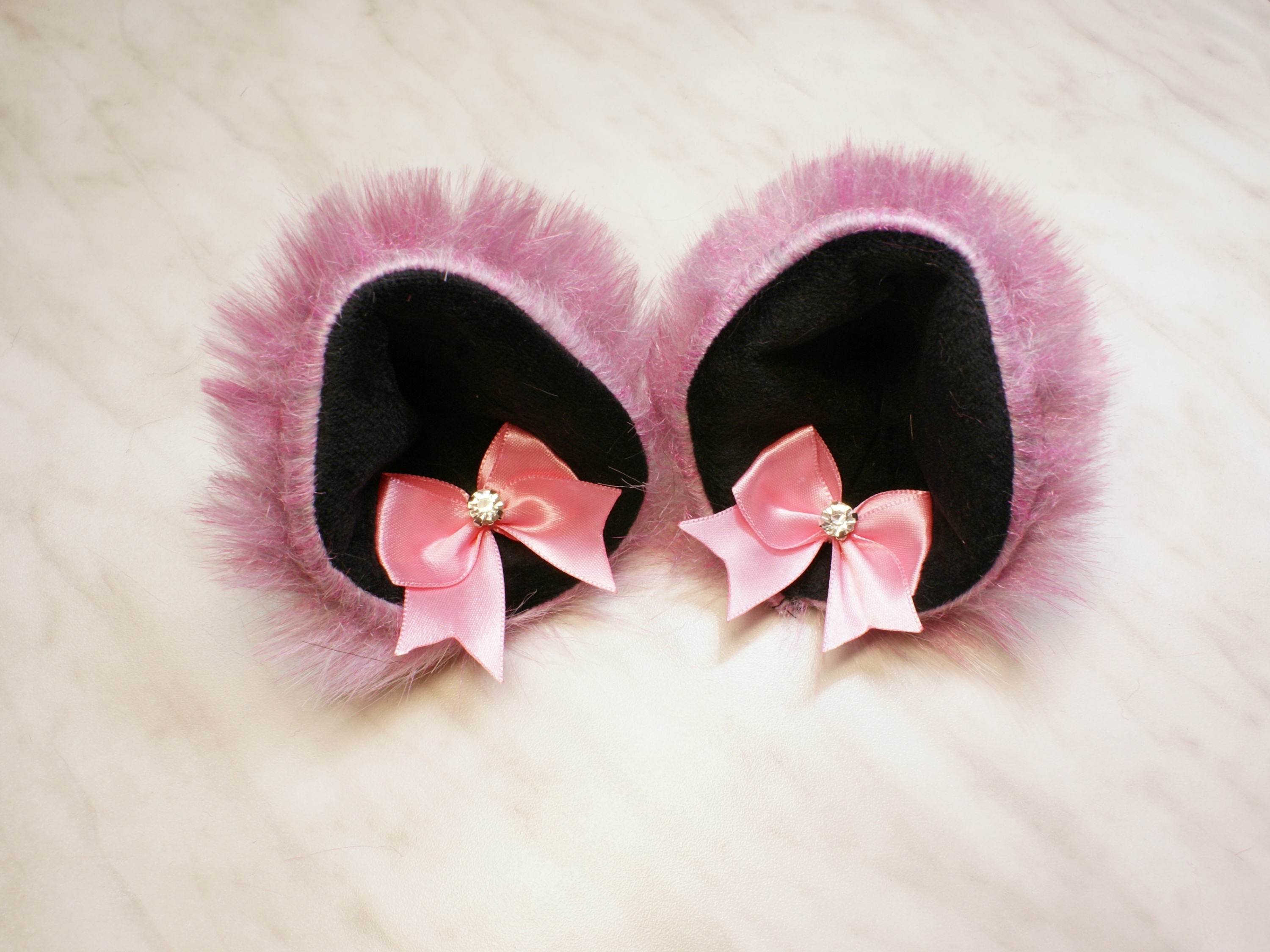 The ears are made of faux fur. Satin ribbons, as ornaments. A bell is attached to the ribbon. A metal clip for attaching the ears is attached to the underside of the ears. Added metal headband so that the ears can be attached to the headband. So you have more options for wearing ears. You can wear them in several ways.