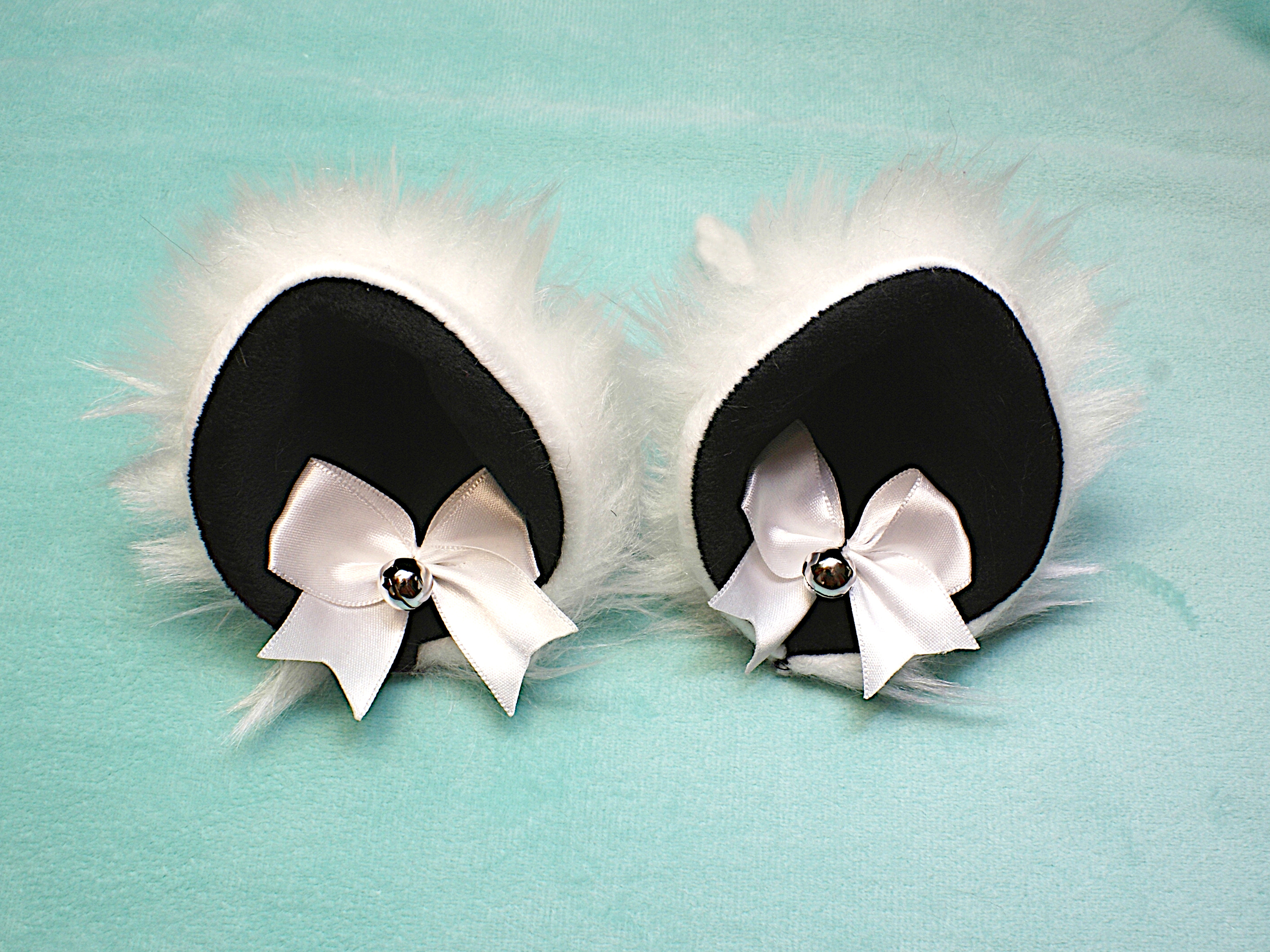 The ears are made of faux fur. Satin ribbons, as ornaments. A bell is attached to the ribbon. A metal clip for attaching the ears is attached to the underside of the ears. Added metal headband so that the ears can be attached to the headband. So you have more options for wearing ears. You can wear them in several ways.