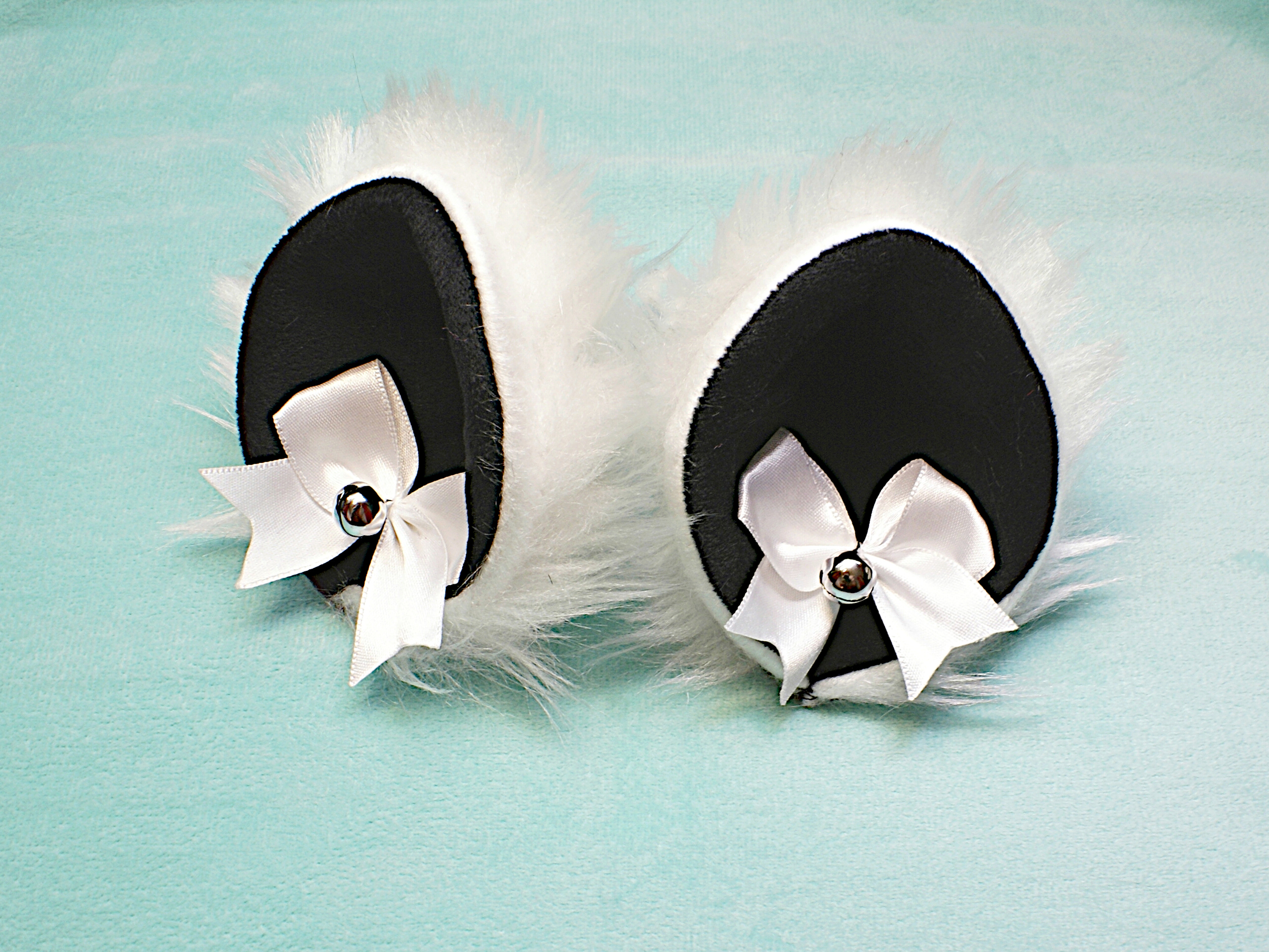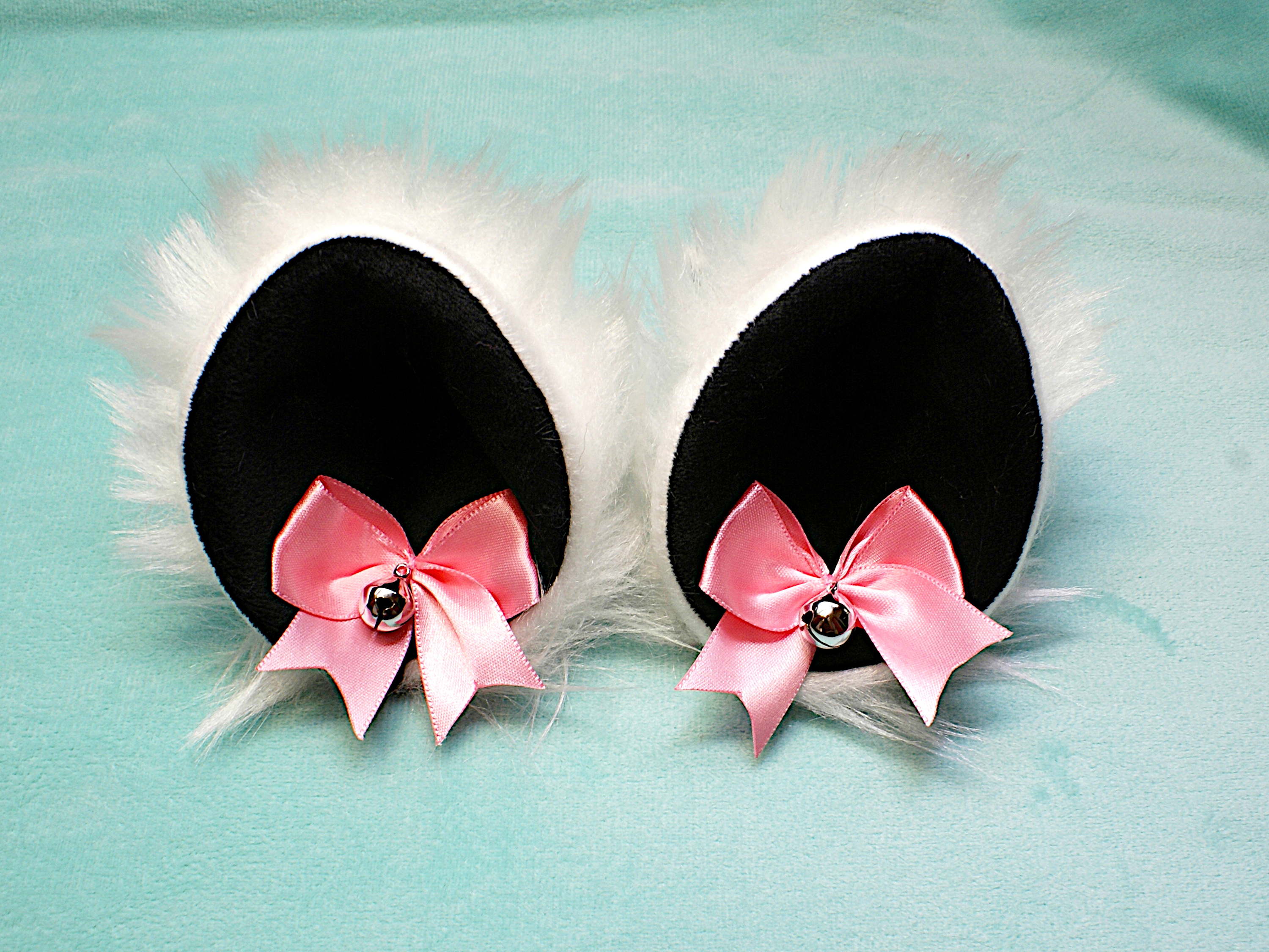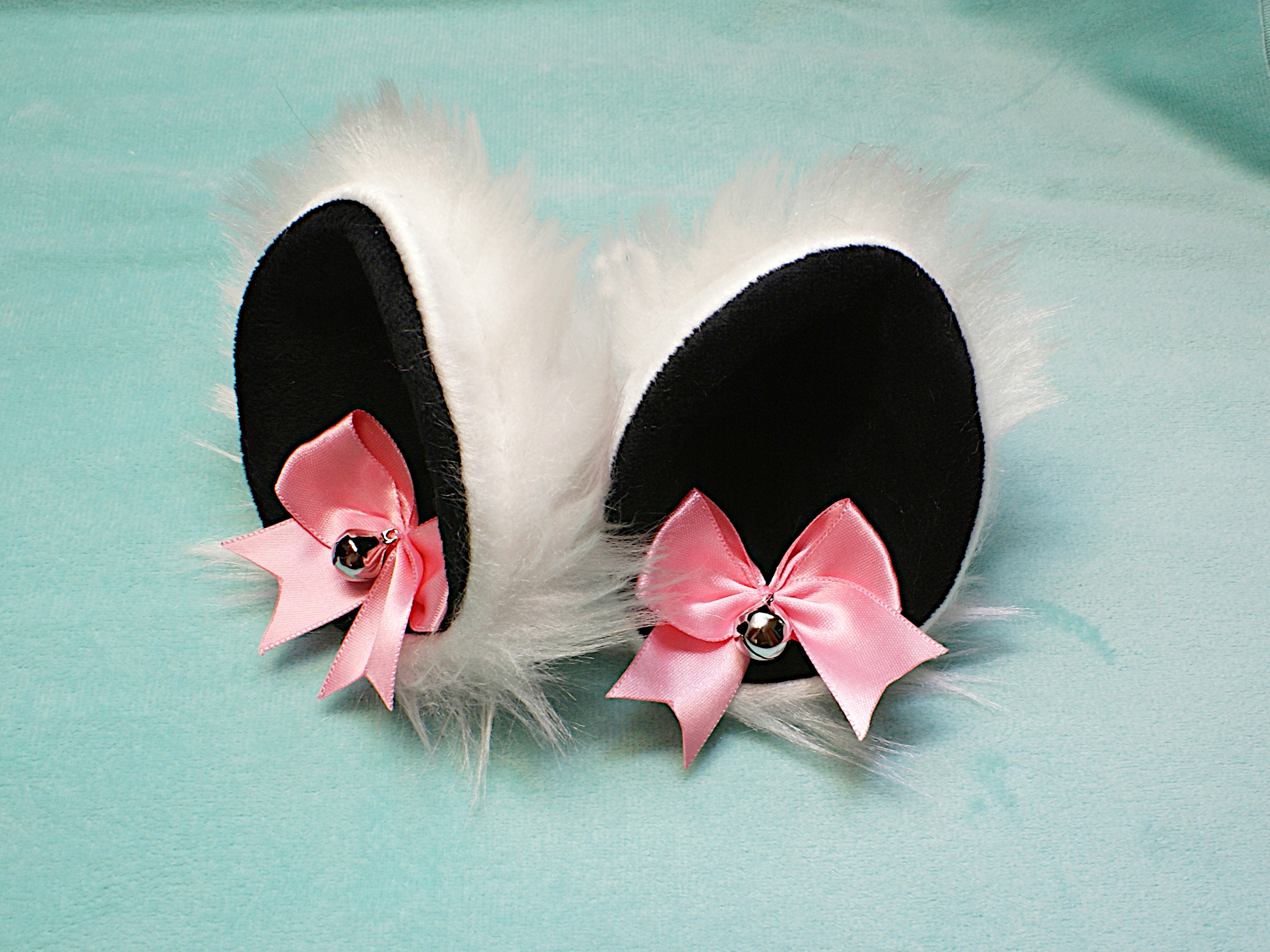 The ears are made of faux fur. Satin ribbons, as ornaments. A bell is attached to the ribbon. A metal clip for attaching the ears is attached to the underside of the ears. Added metal headband so that the ears can be attached to the headband. So you have more options for wearing ears. You can wear them in several ways.