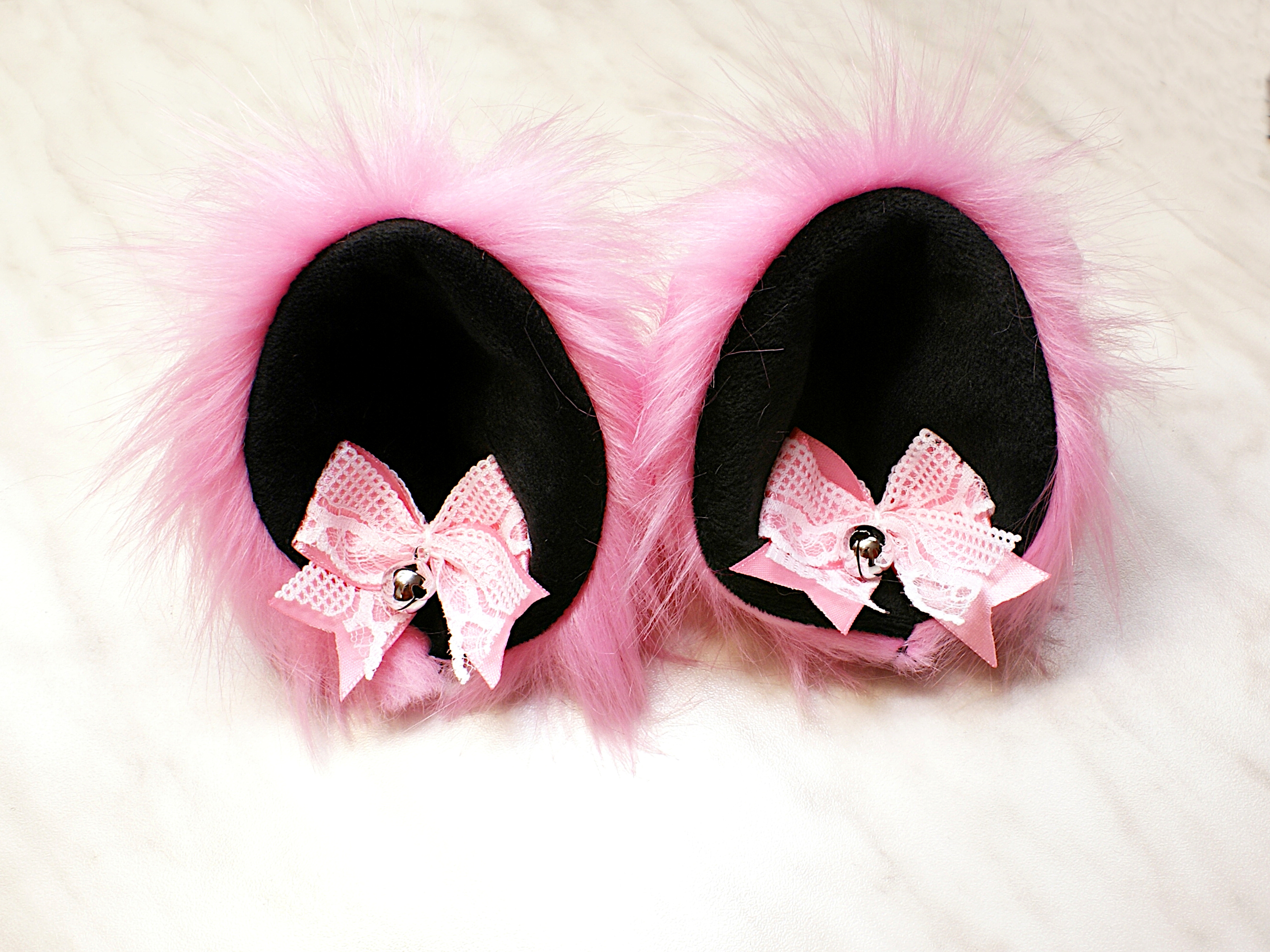 The ears are made of faux fur. Satin ribbons, as ornaments. A bell is attached to the ribbon. A metal clip for attaching the ears is attached to the underside of the ears. Added metal headband so that the ears can be attached to the headband. So you have more options for wearing ears. You can wear them in several ways.