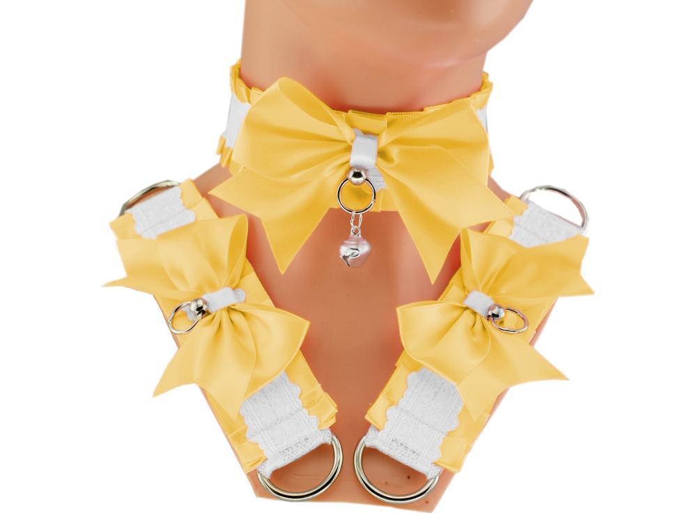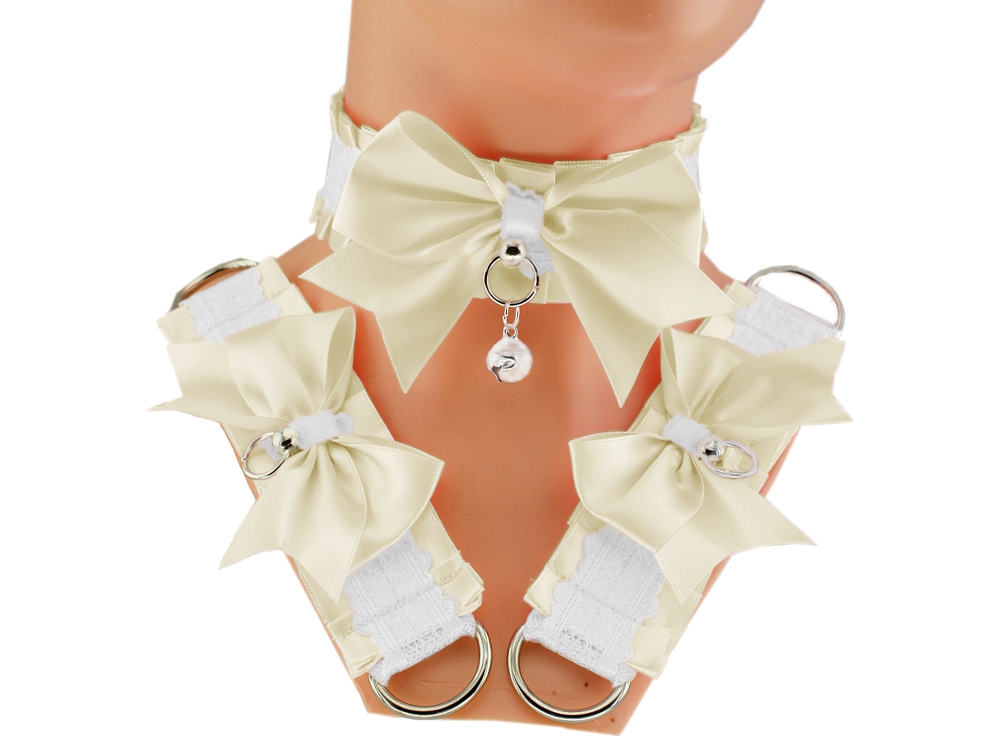 Collar is made layers of fabric and decorative lace. Details are made of metal, and satin ribbon, bells. Lace is only on outer site.