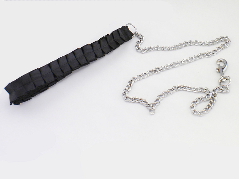 All collars are lined with poly webbing with welded D-rings in the back, attaching charms and bells.