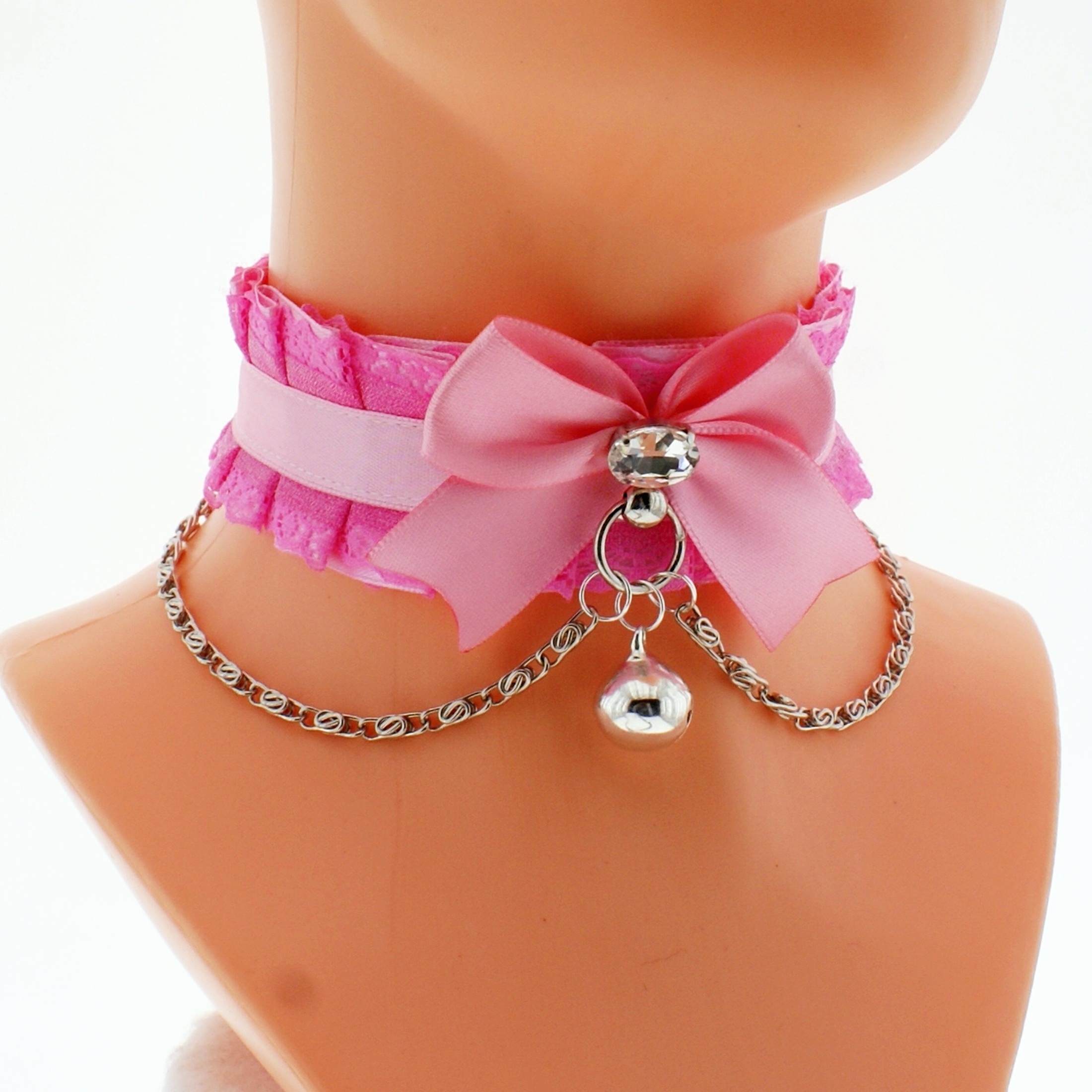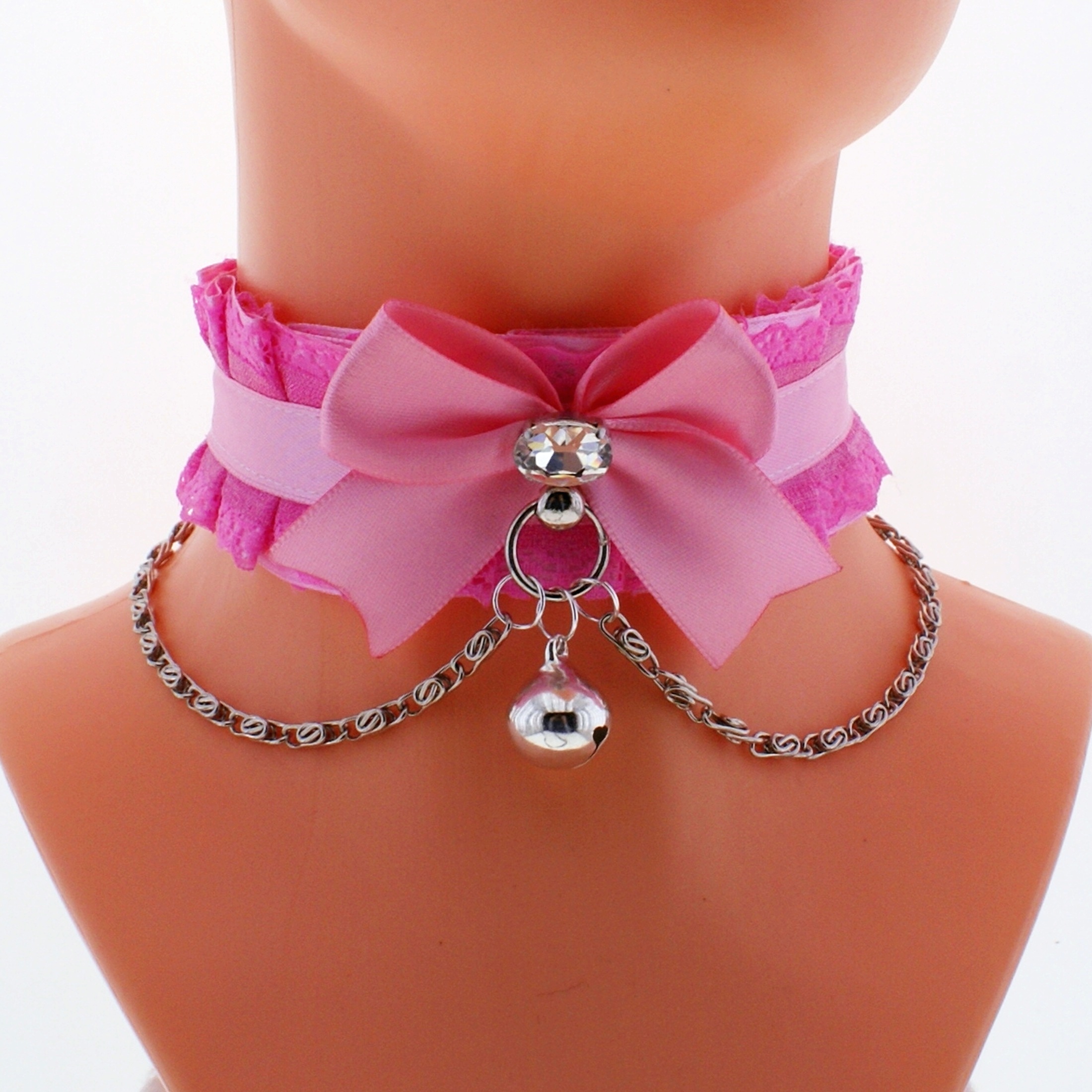 Kittenplay Collar Black Kitten Pet Play Collar Gear Choker Necklace Satin organza Chain Bow Bell Tug Proof Daddys Girl Kawaii goth Gothic